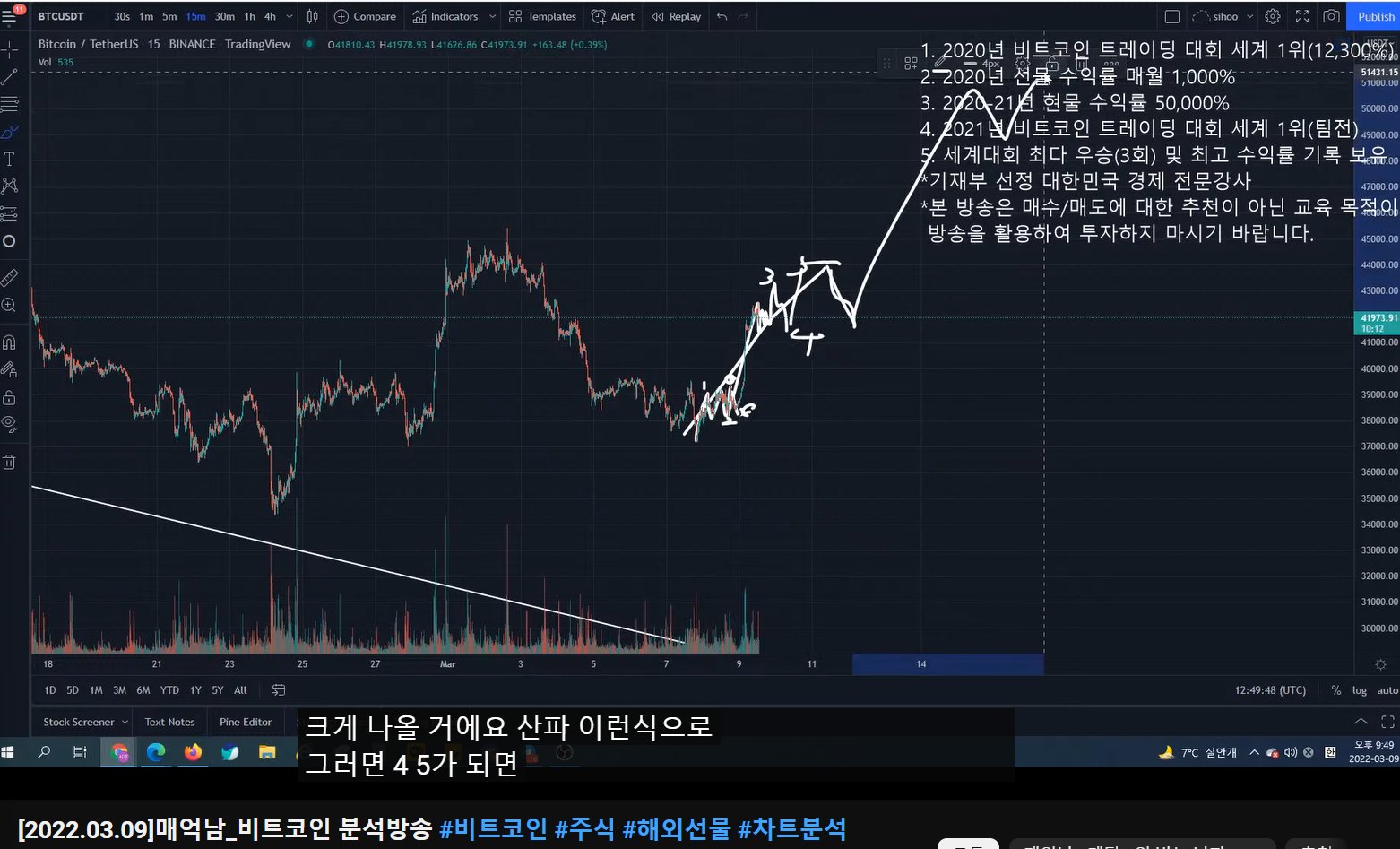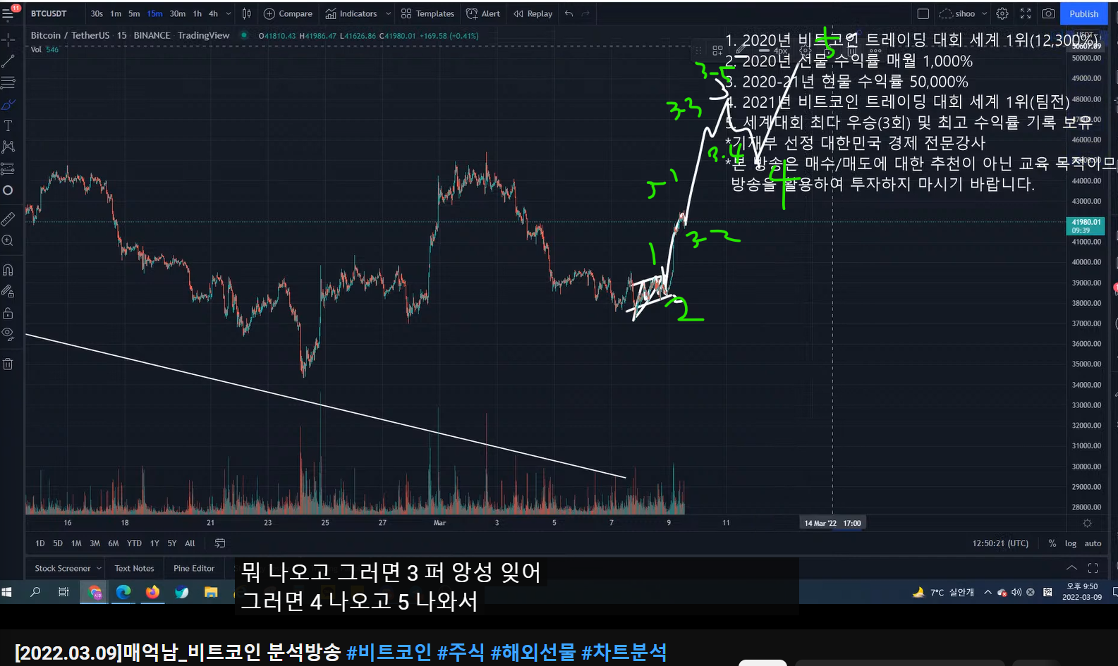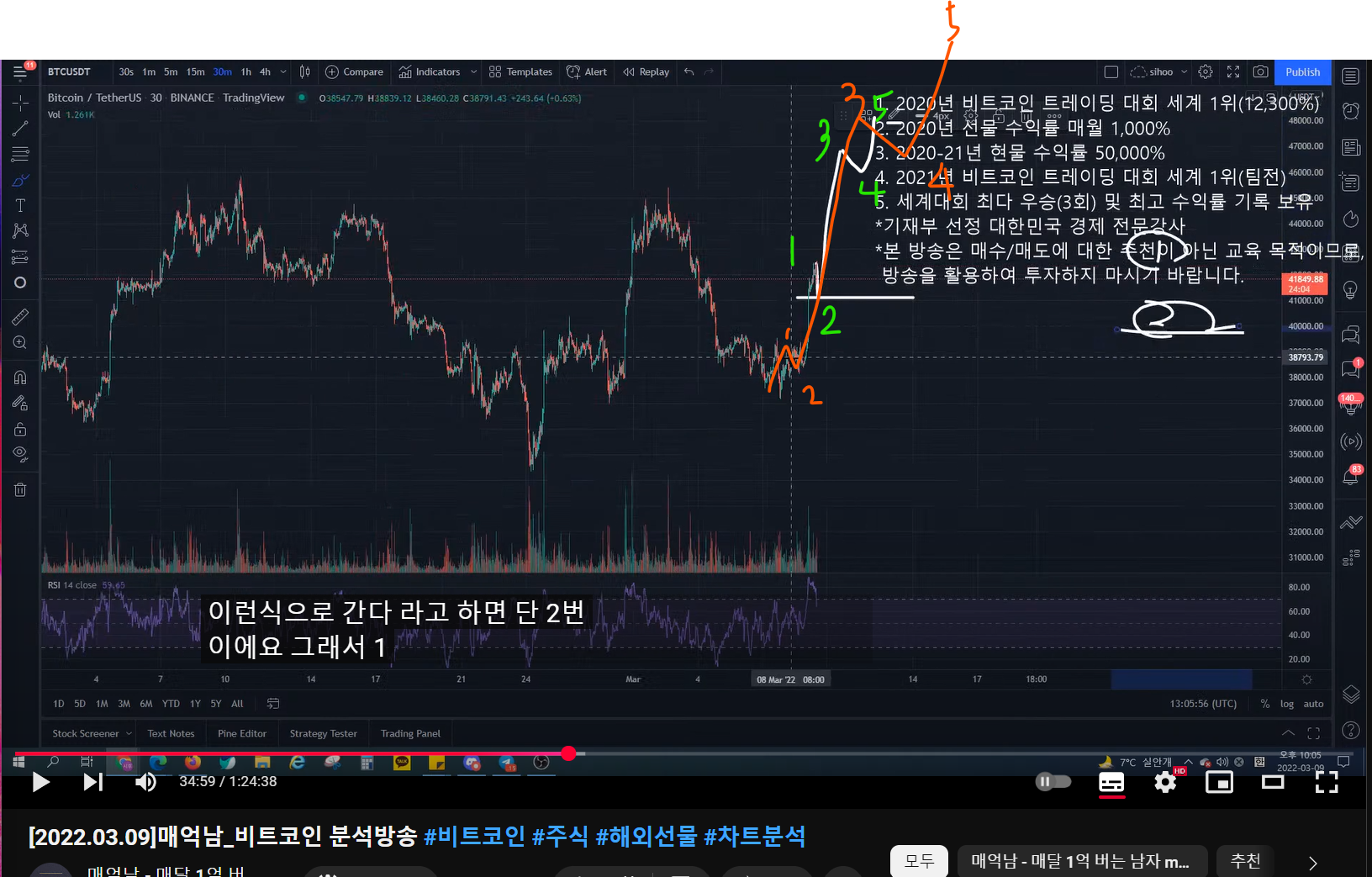 - 더 크게 봤을 때, 여기까지가 1파이고, 2파 조정 이후에 크게 3(이렇게 되면 3파가 크게 나올 것이다), 4, 5파가 나오면서 52k까지 가는 시나리오가 나올 수 있다.