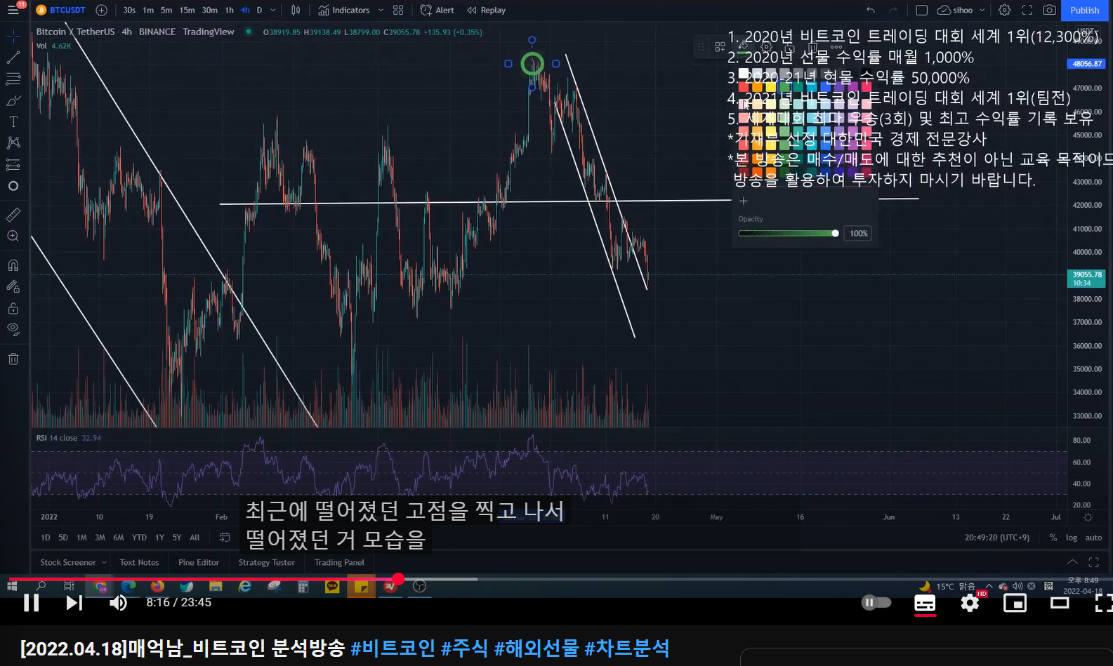 - 최근 떨어졌던 모습을 보면, 앞서 큰 하락처럼 추세를 그어볼 수 있다.