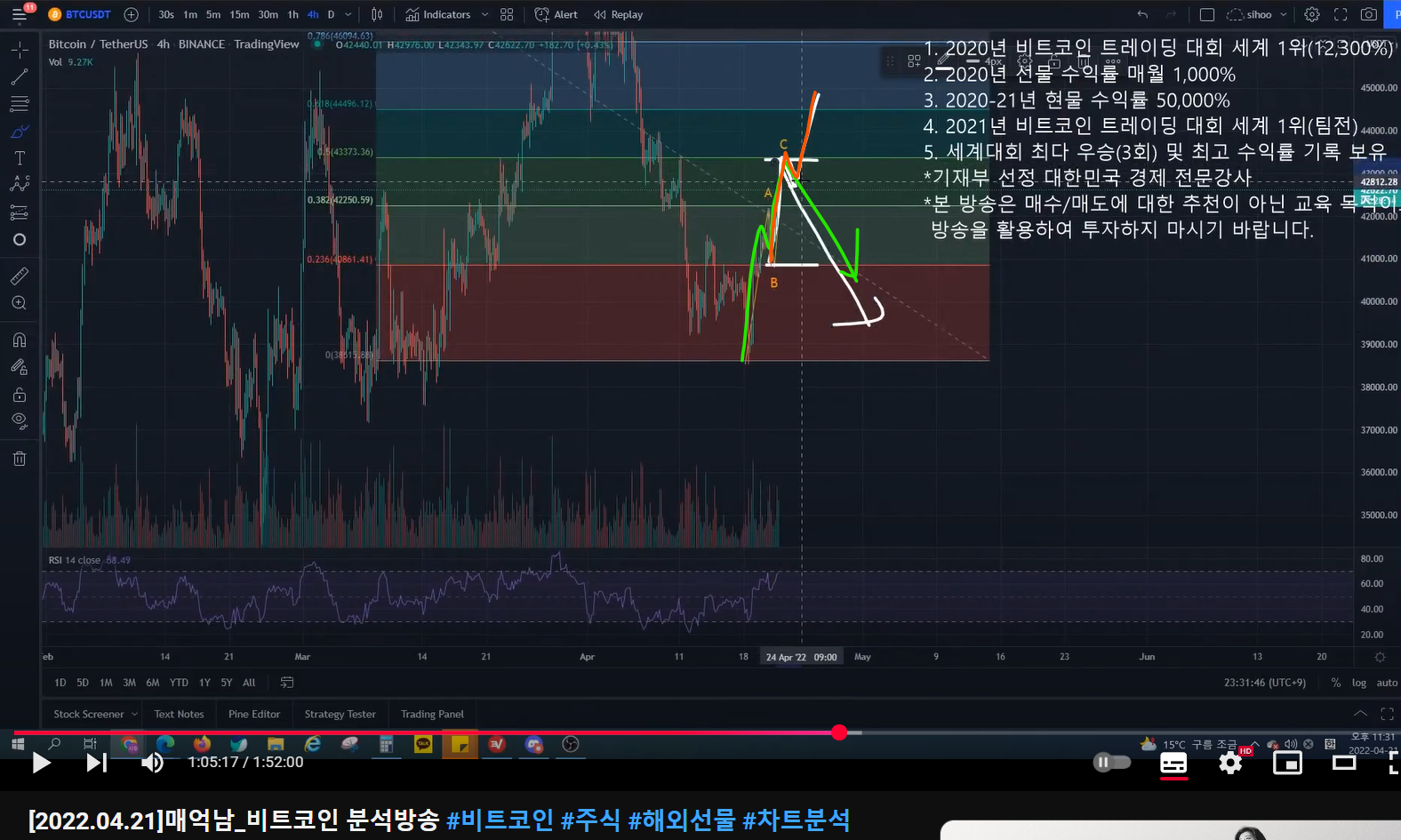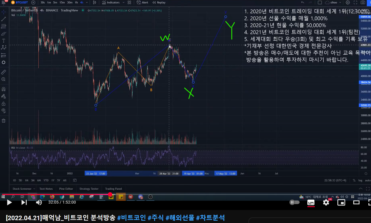 - 그러면 이전 구간 연두 반등이 임펄스가 아니라 ABC였다는 것이고, 반등 이후 하방으로 가겠다는 것이다.