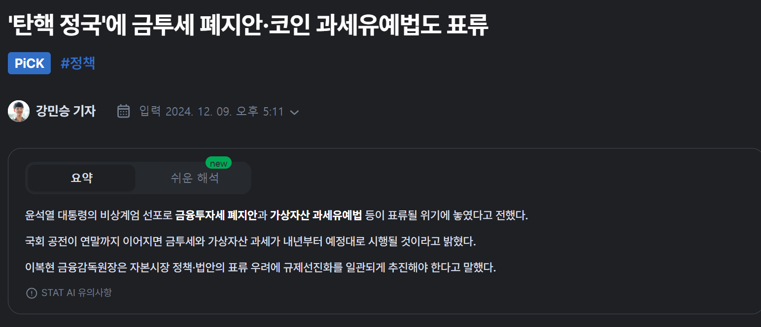 - 2024년 세금 유예법안도 현재 윤통 계엄령 이슈로 인해 딜레이되고 있다. 이 부분이 어떻게 되느냐에 따라서 김치 프리미엄도 요동칠수 있겠다.