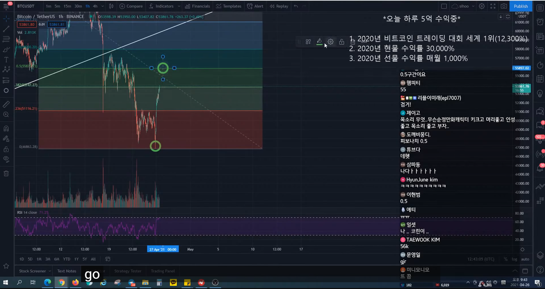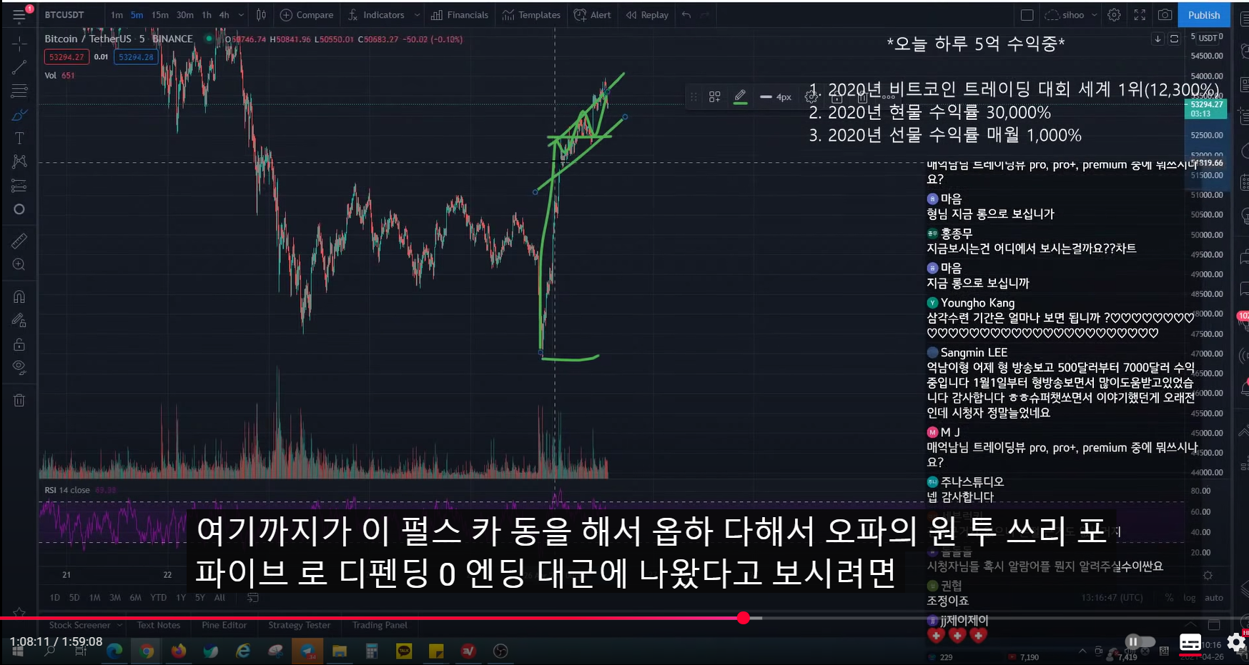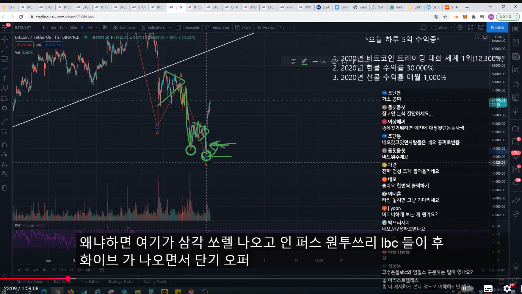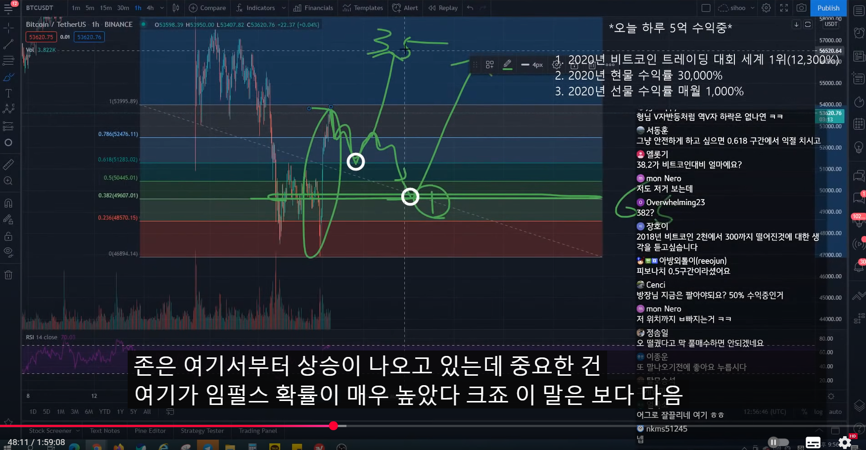 - 말한 대로 55k까지(피보나치 0.5구간)는 올라갈 것이라고 보고 있다.(매억남)