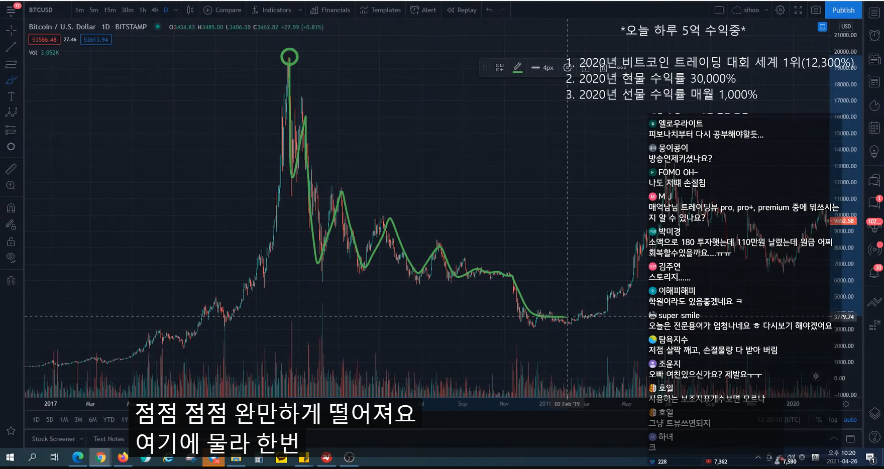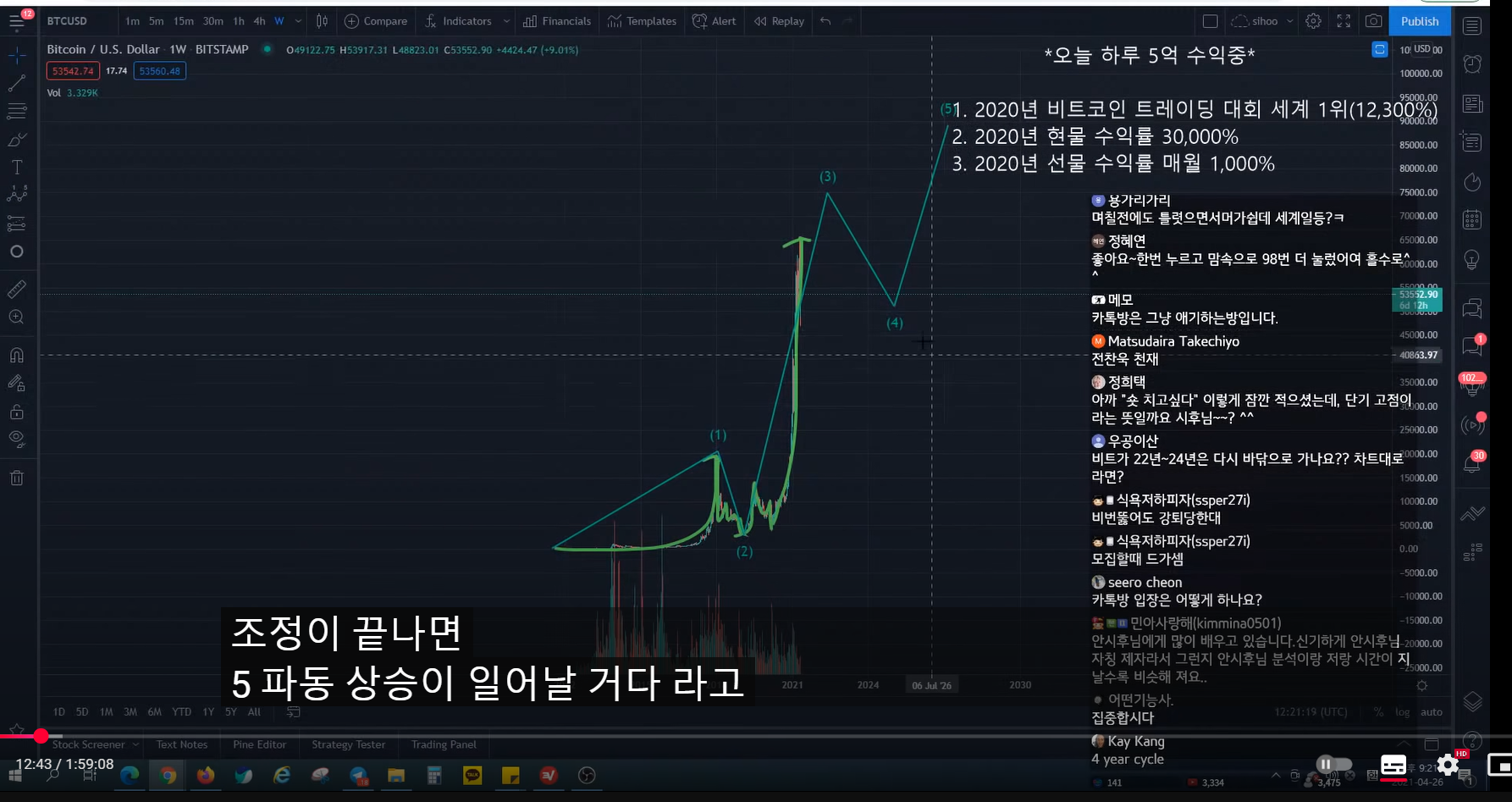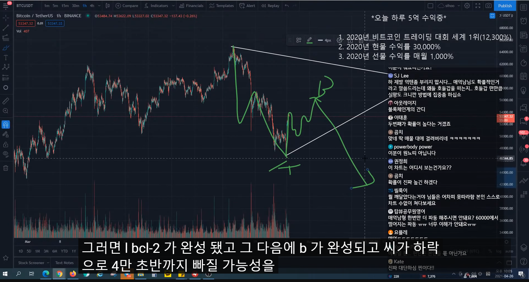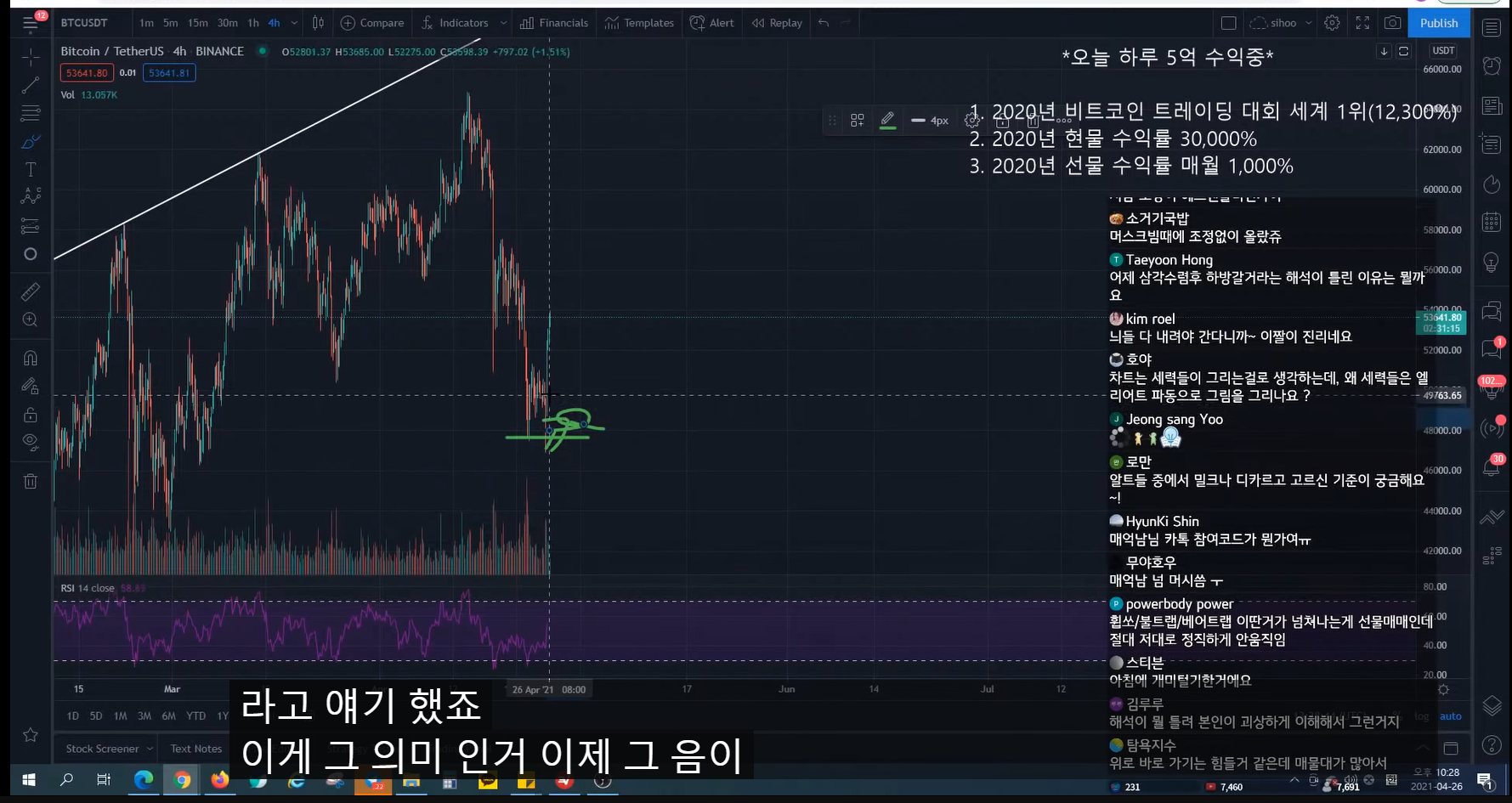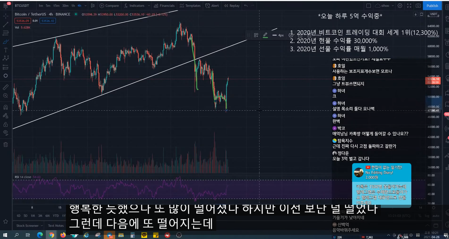 - 말한 대로 55k까지(피보나치 0.5구간)는 올라갈 것이라고 보고 있다.(매억남)
