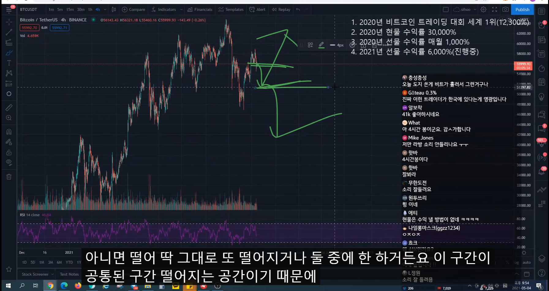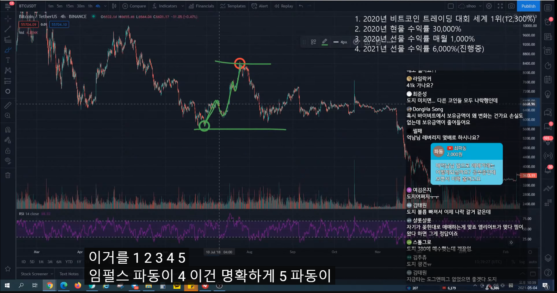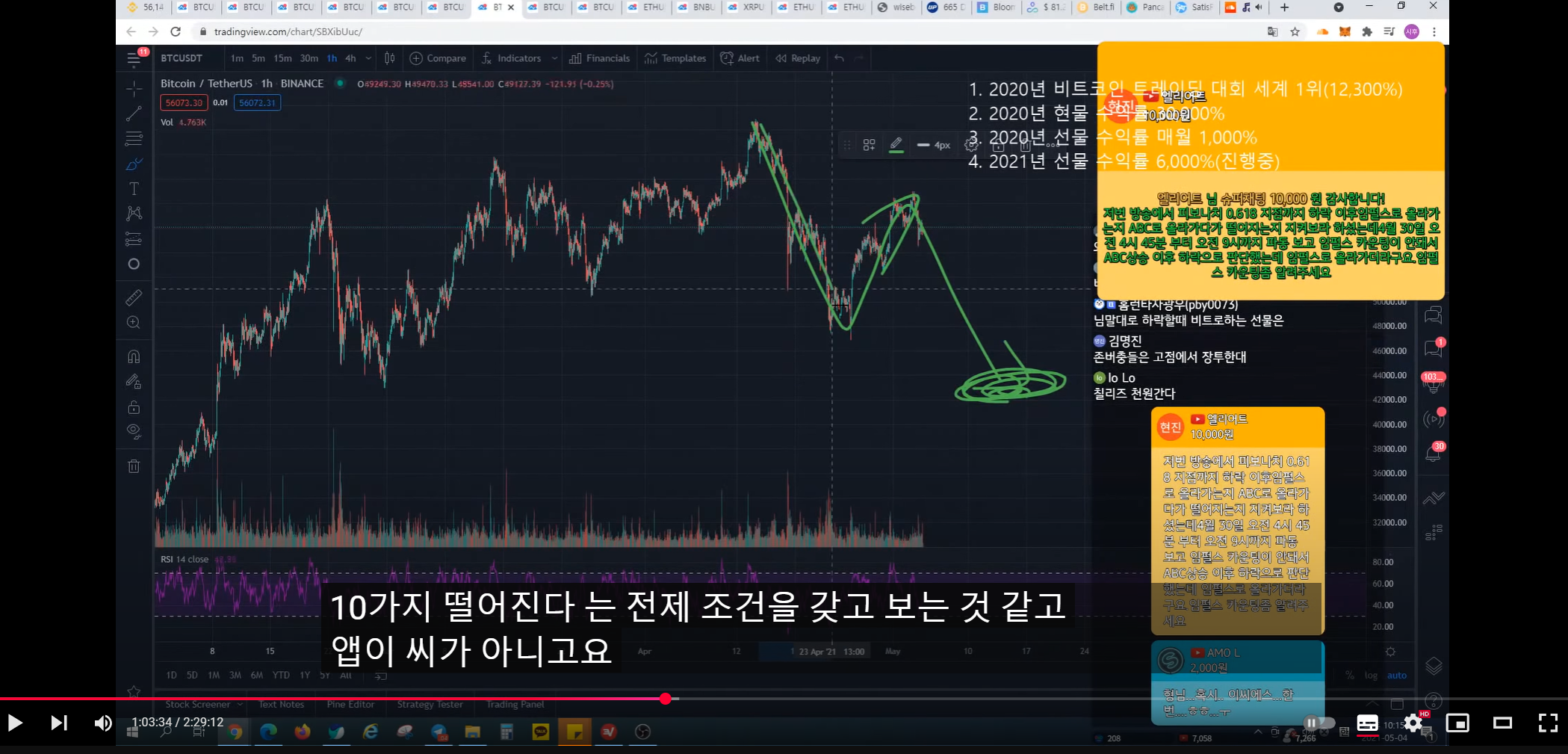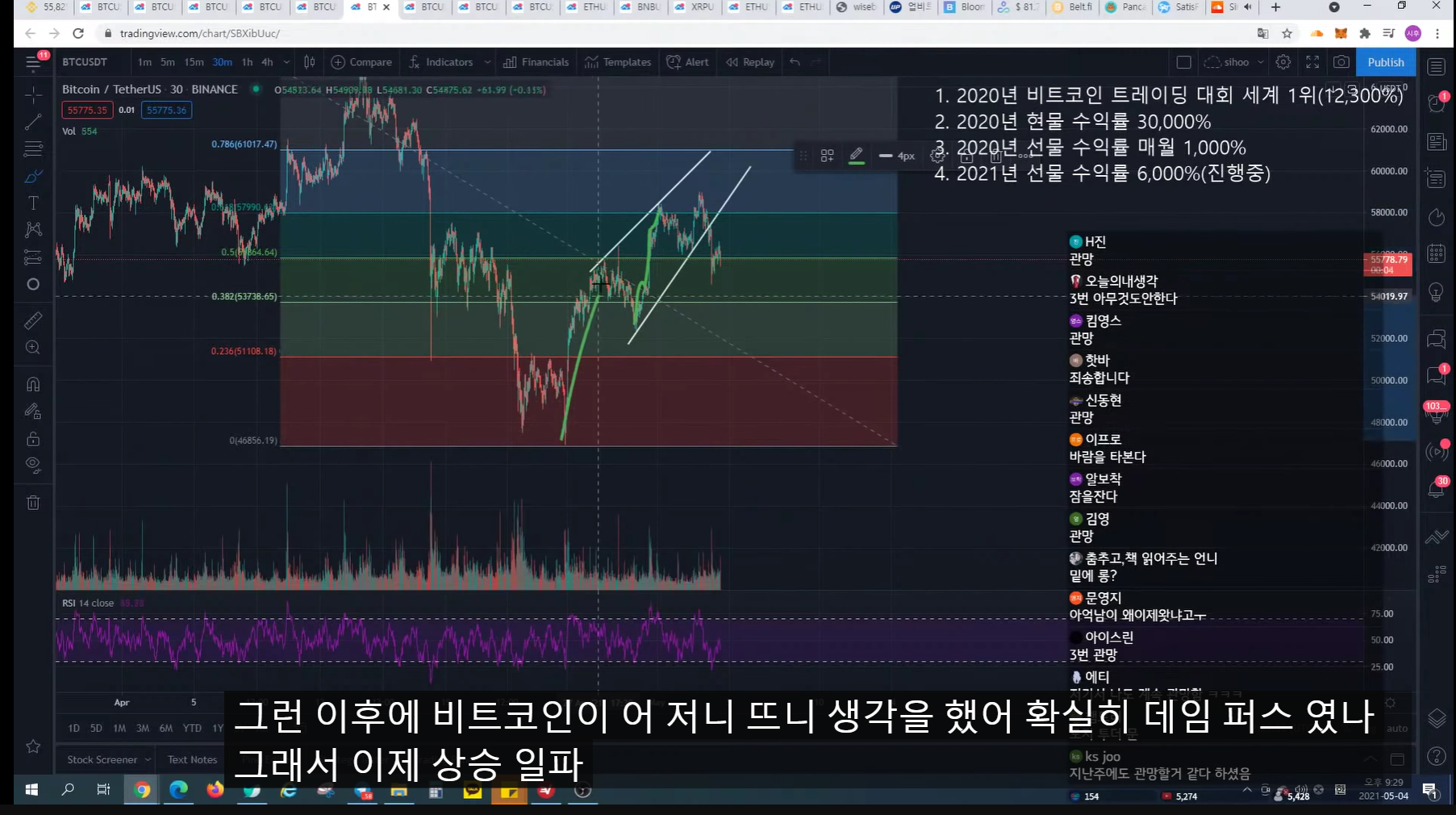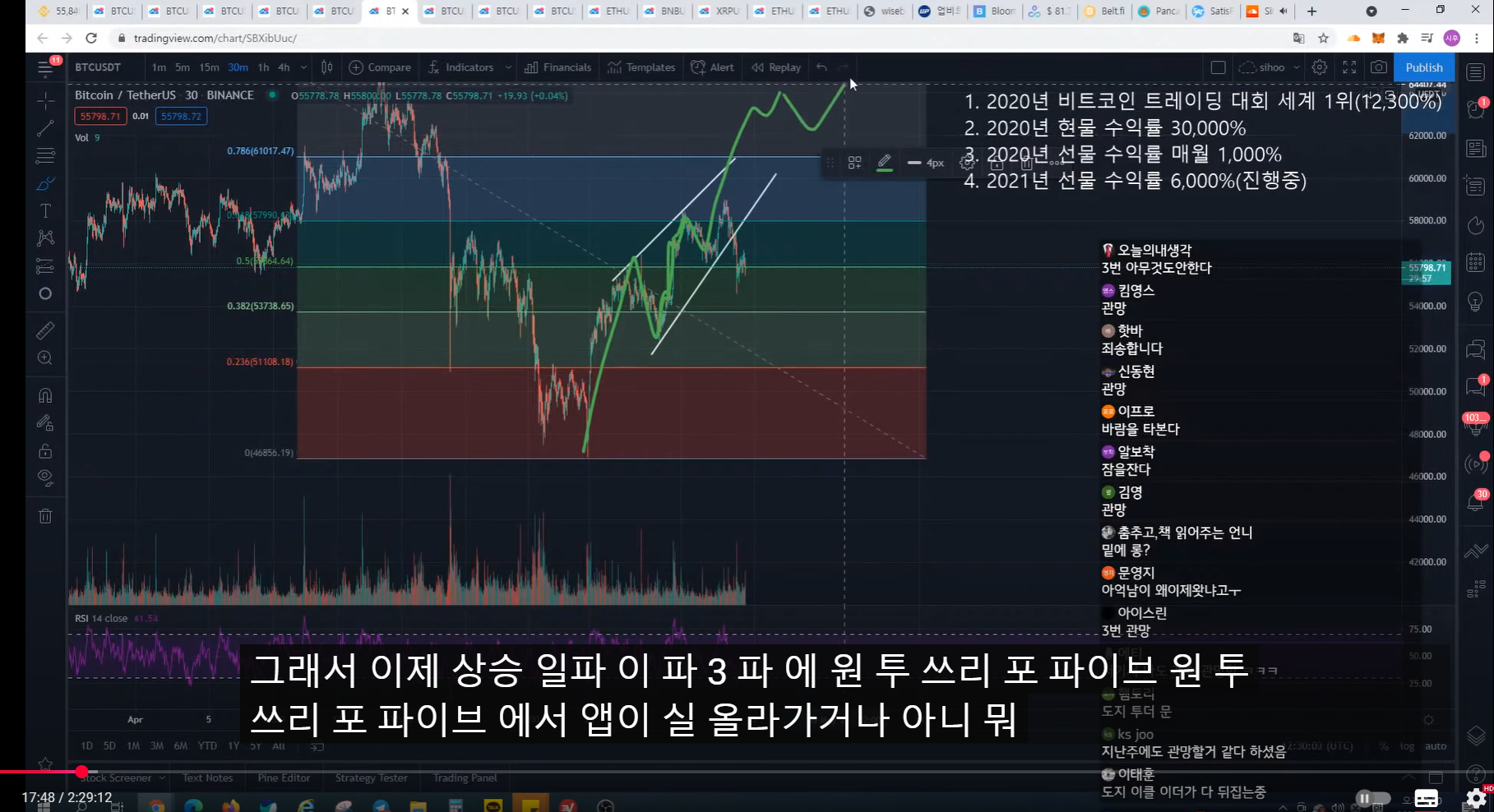 지난번 방송 시 47k에서 피보나치 0.5구간까지 반등 예상