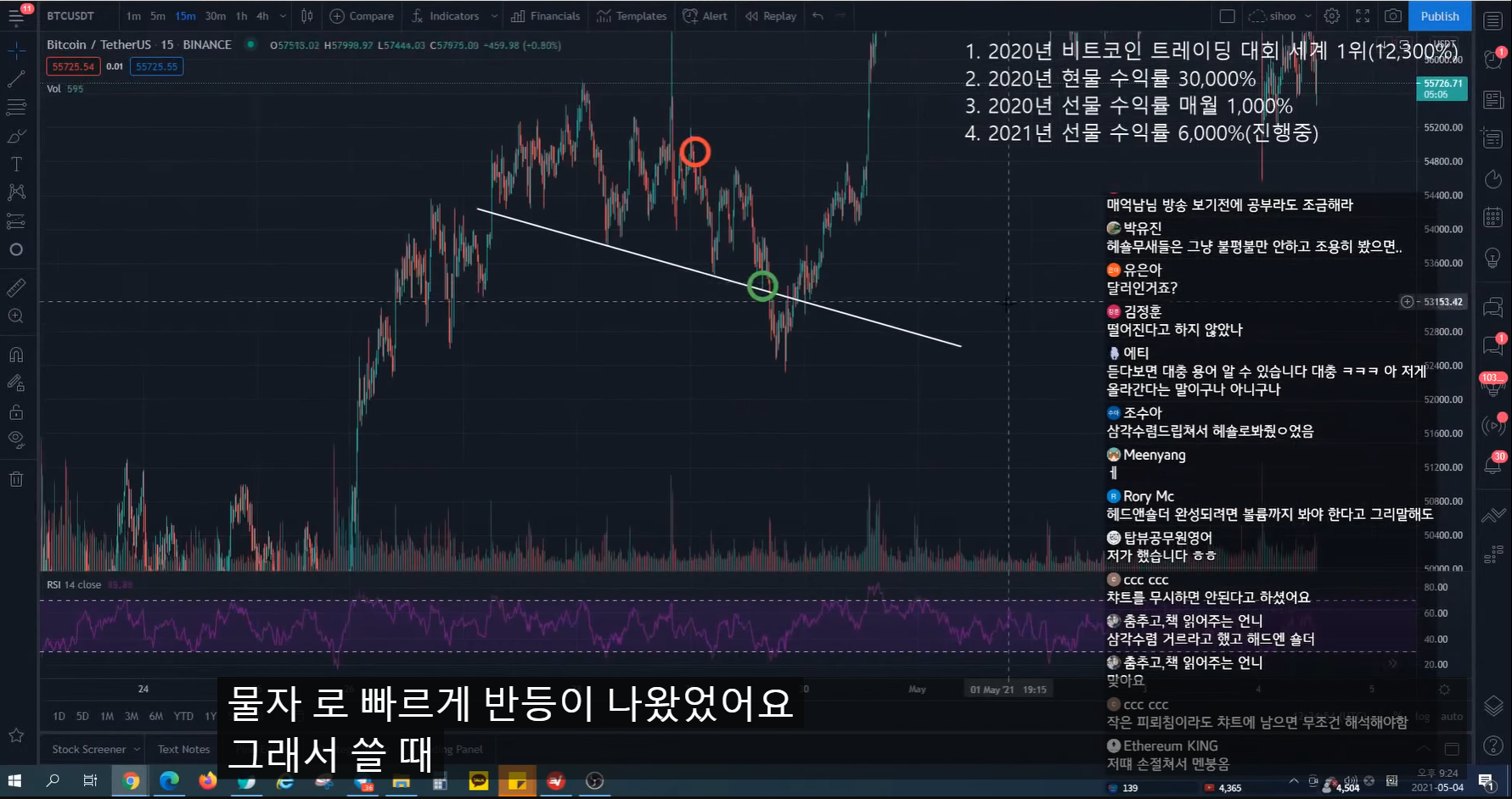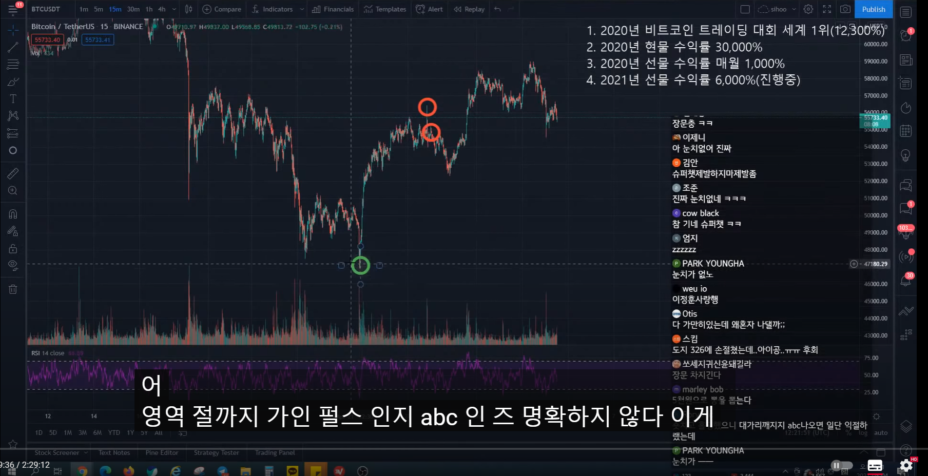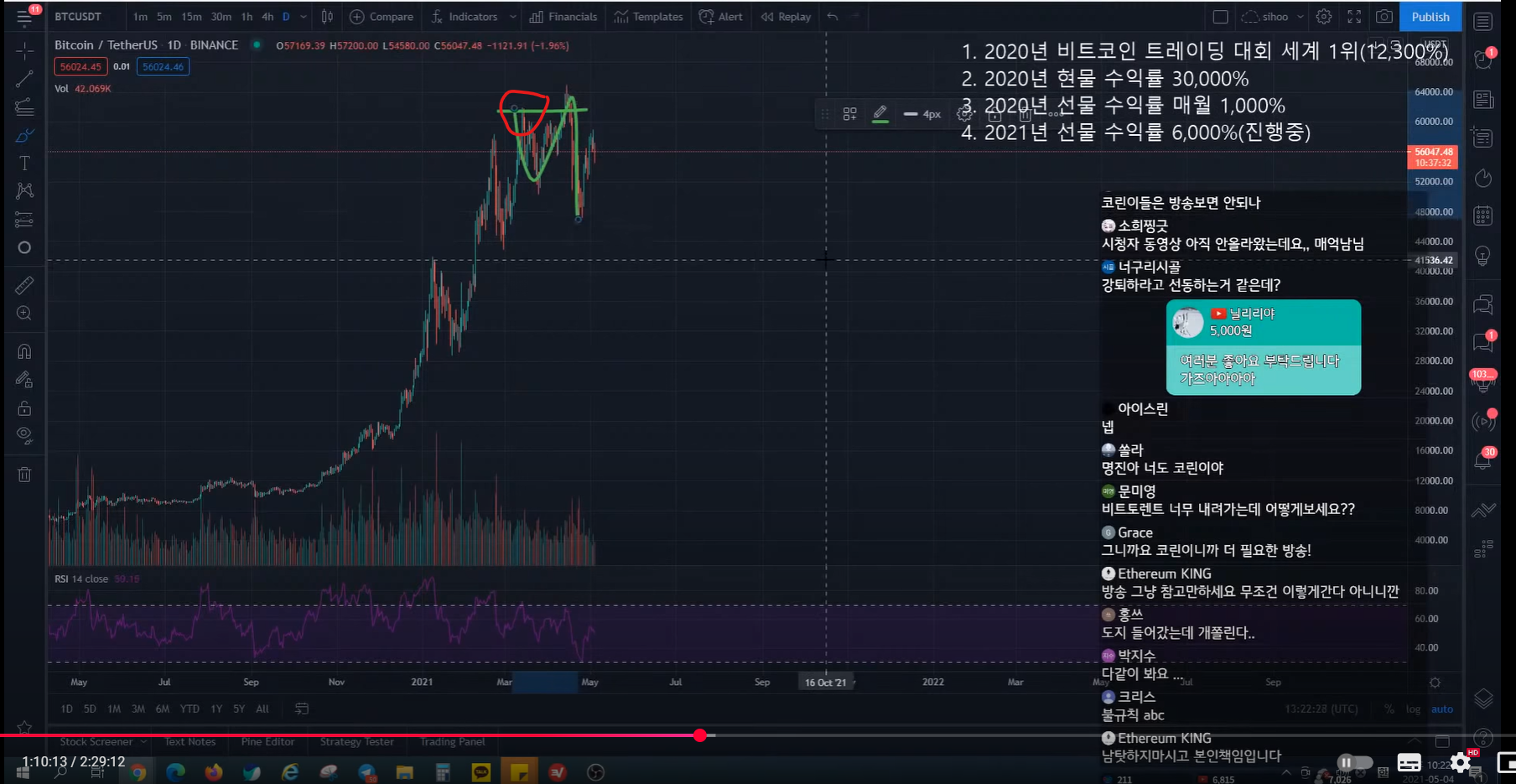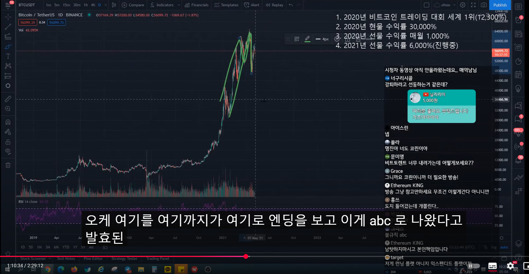 지난번 방송 시 47k에서 피보나치 0.5구간까지 반등 예상
