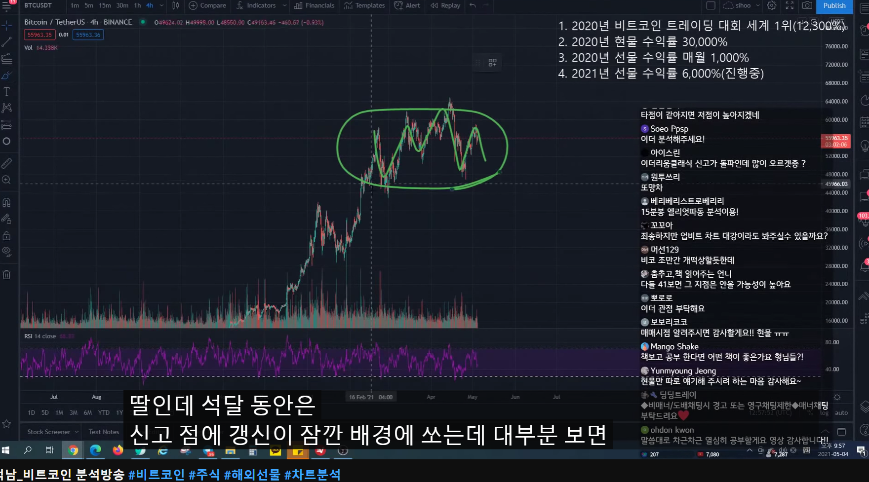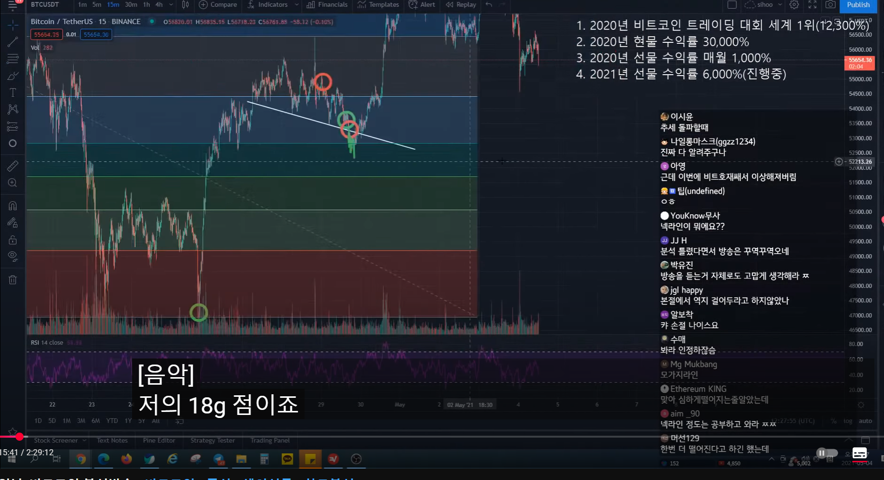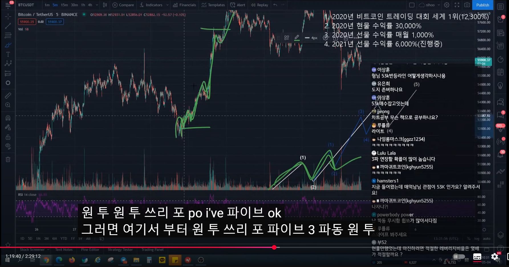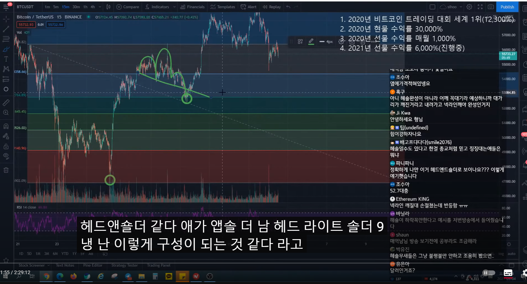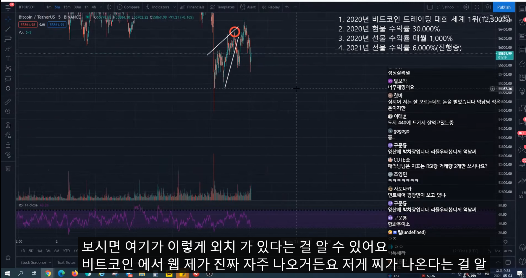 지난번 방송 시 47k에서 피보나치 0.5구간까지 반등 예상