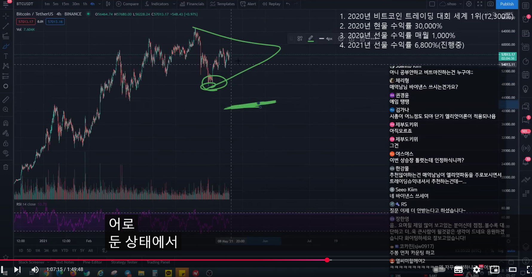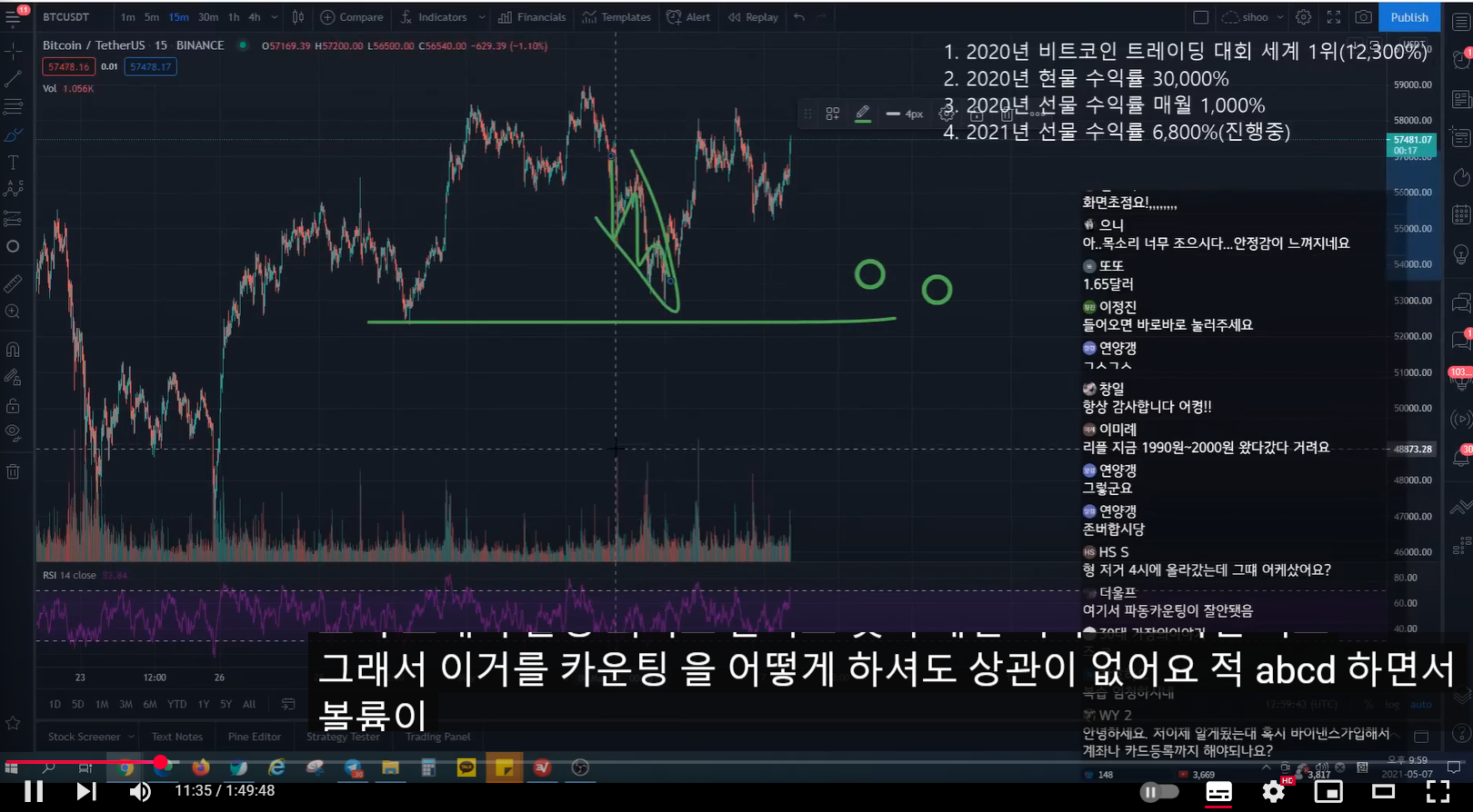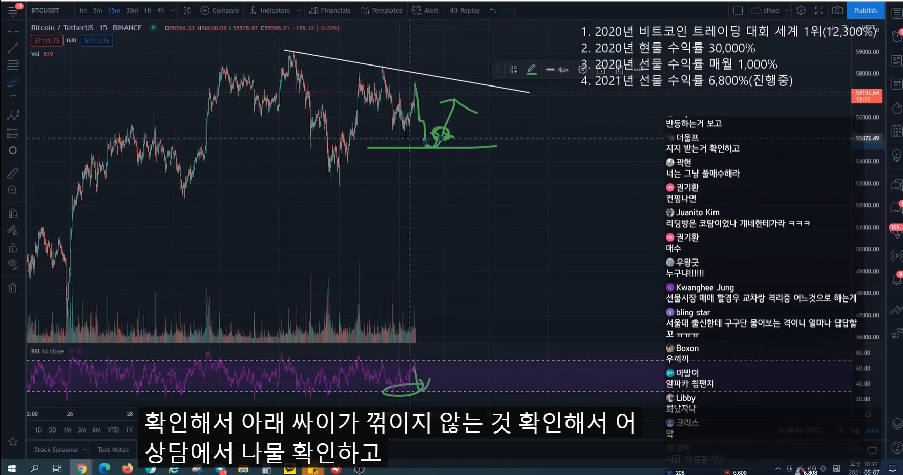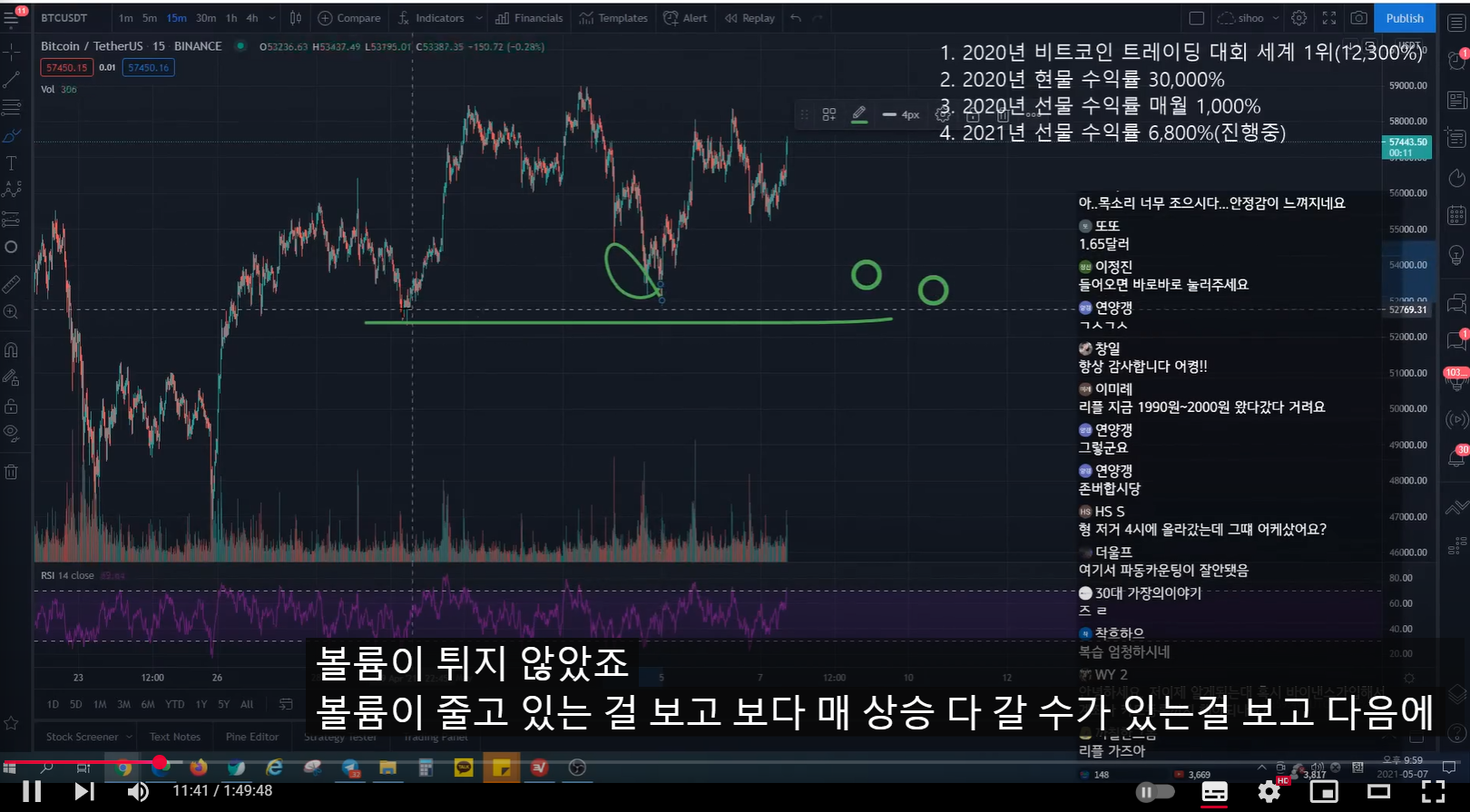 - 지난 방송 이전에 많이 떨어지면서 rsi가 많이 하락했었다. 그래서 지난 방송 시점에 어느 정도 떨어지면서 rsi가 조금 하락하면, 15분 봉 상승 다이버전스 발생하면서 추세가 전환될 자리라고 말했었다.