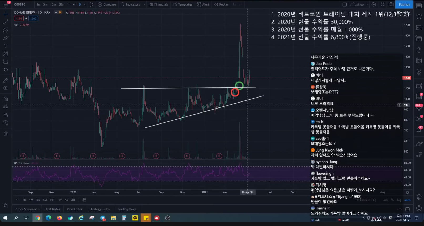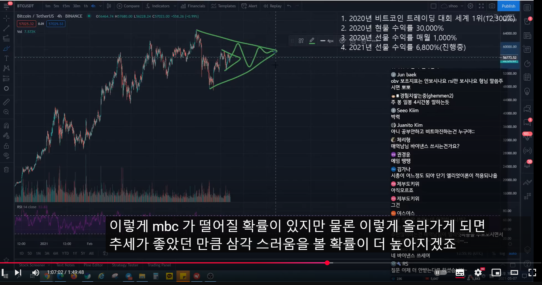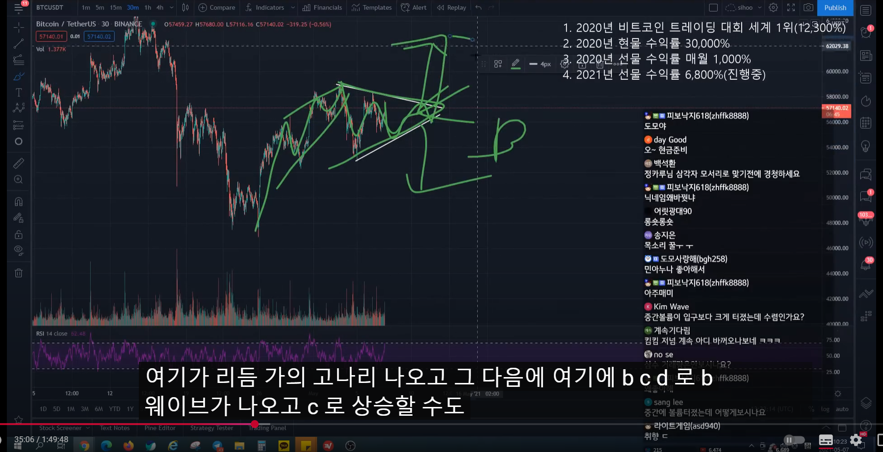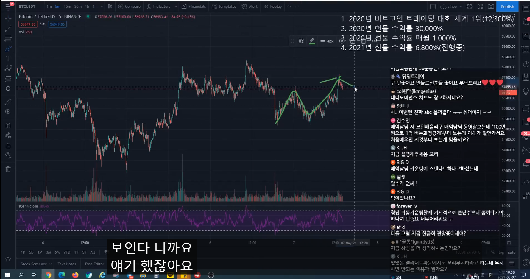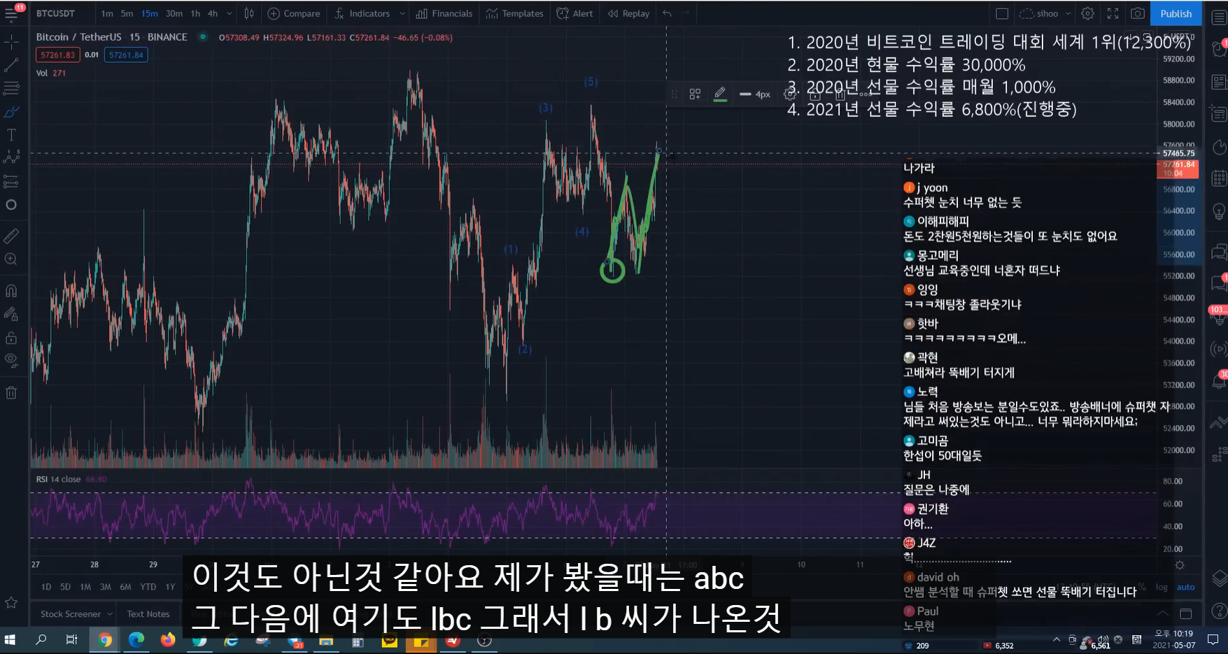 - 지난 방송 이전에 많이 떨어지면서 rsi가 많이 하락했었다. 그래서 지난 방송 시점에 어느 정도 떨어지면서 rsi가 조금 하락하면, 15분 봉 상승 다이버전스 발생하면서 추세가 전환될 자리라고 말했었다.