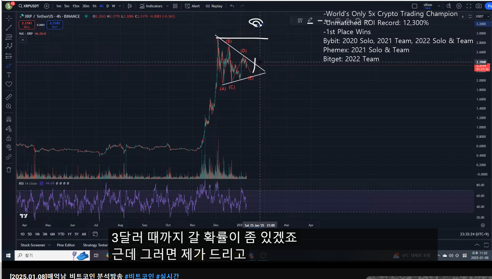 - 만약 삼각 수렴 4파 구간이면, ABCDE로 카운팅 할 수 있다. 이후 만약 상방 이탈한다면, 고점을 넘어서 3달러대까지 갈 확률이 좀 있다.