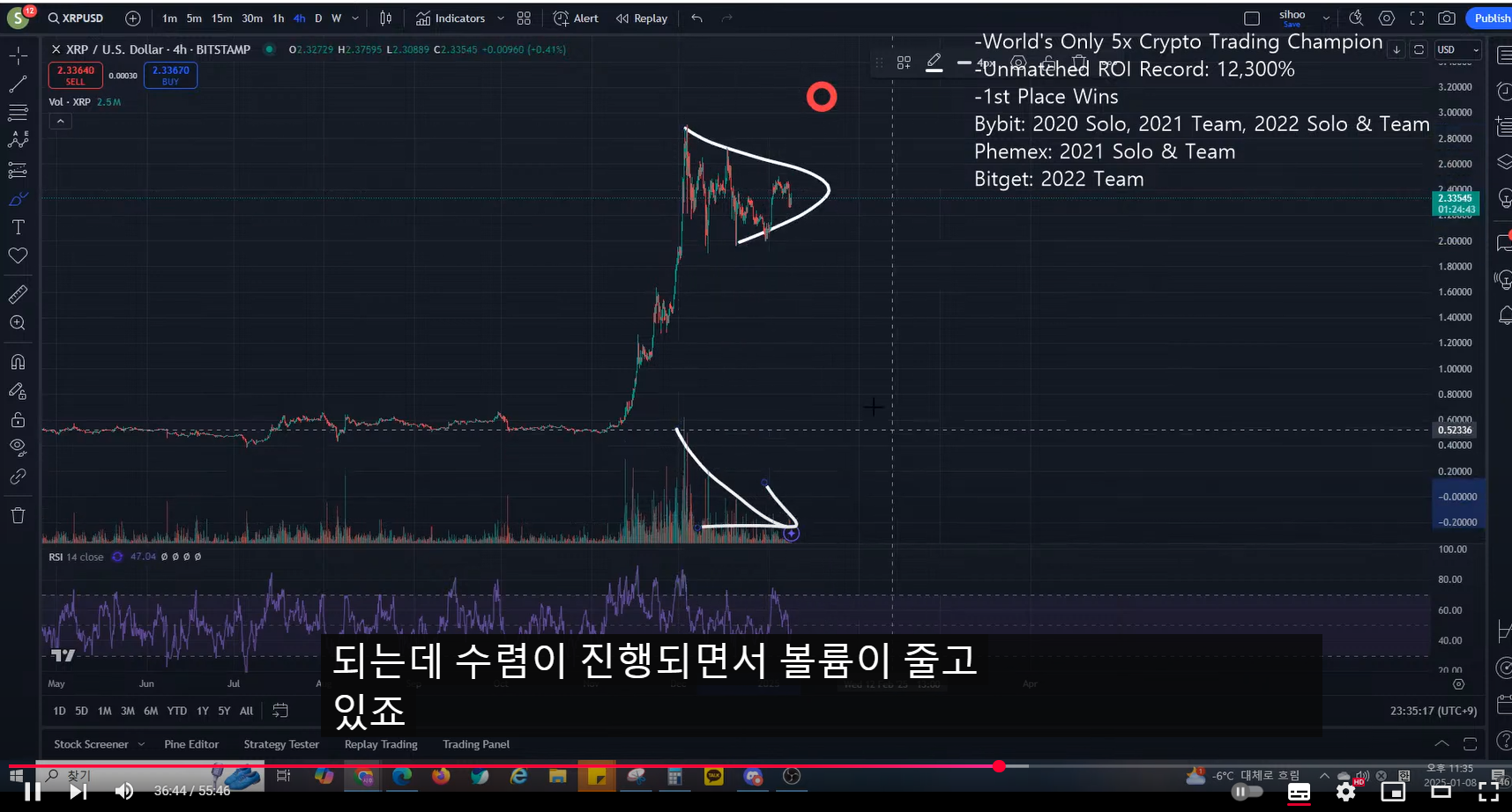 - 임펄스와 삼각수렴이 명확하다. 삼각 수렴은 고점이 낮아지고, 저점이 올라오면서 볼륨이 줄어들어야 하는데, 볼륨이 줄고 있다.