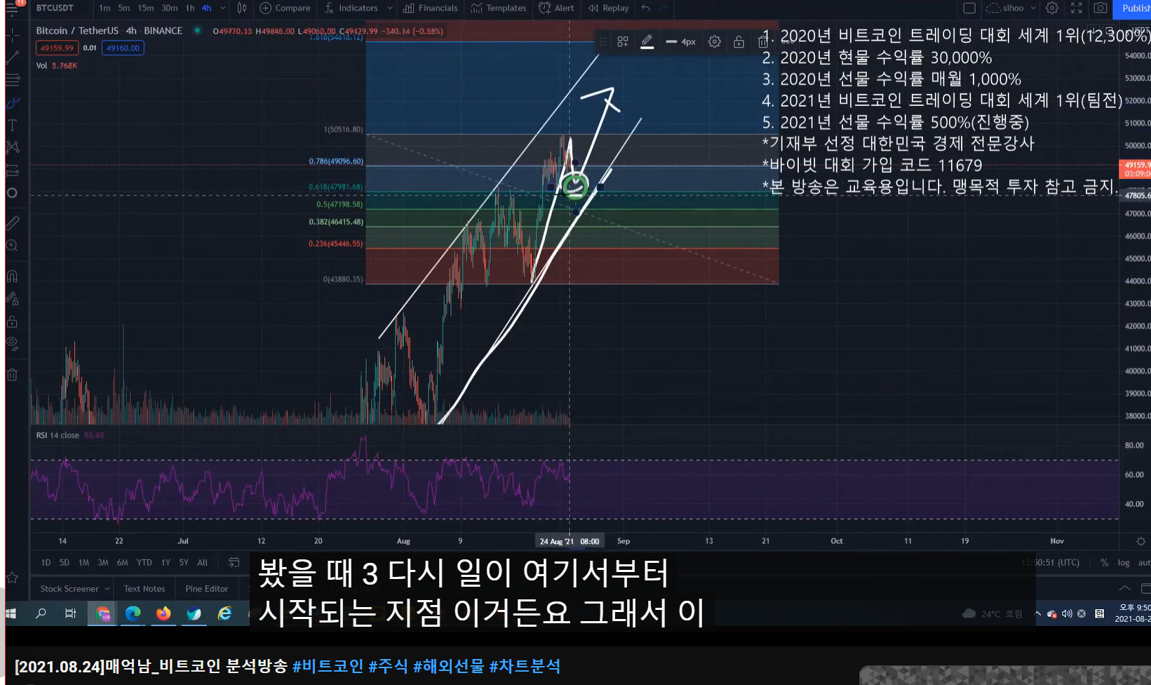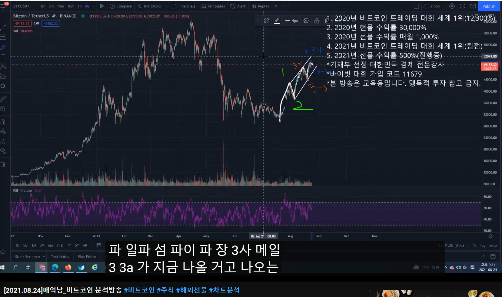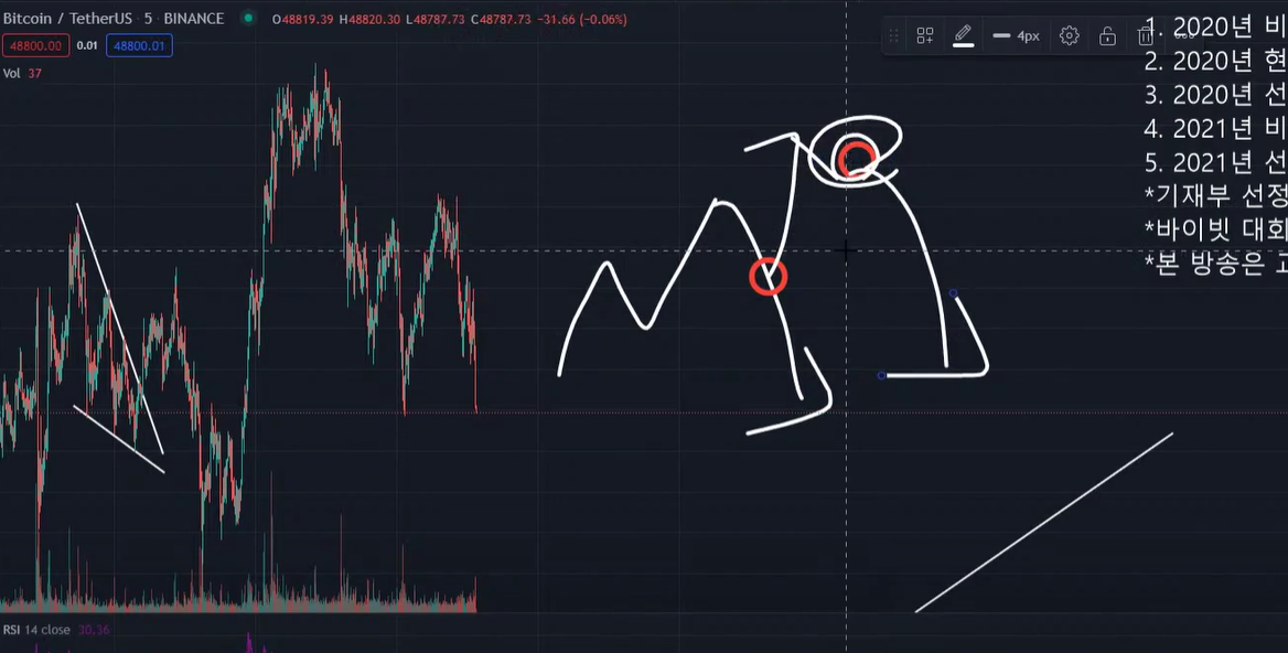 - 3-1 파동이면 피보나치 618 구간 밑으로 잘 안 내려간다. 47k 부근.