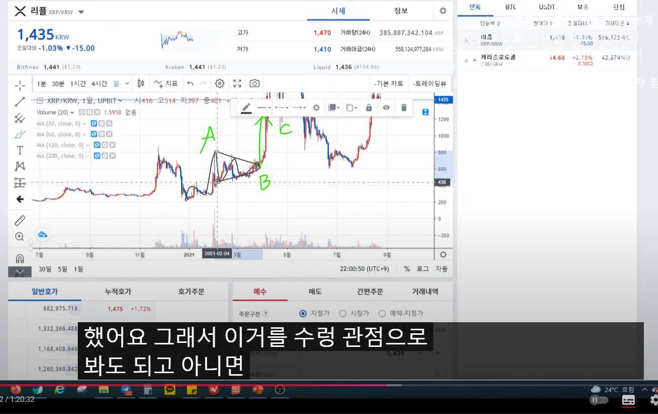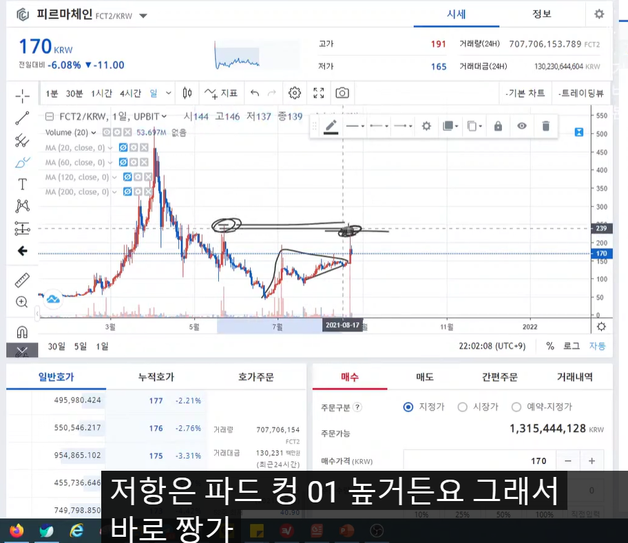 - 피르마체인, AB(삼각수렴) C모양에 슈팅. 이것도 최고점 매도가 됐다. 전매물 대에서 저항을 받을 확률이 높기 때문에 전매물 대 직전에 수익 실현 걸어놓은 것