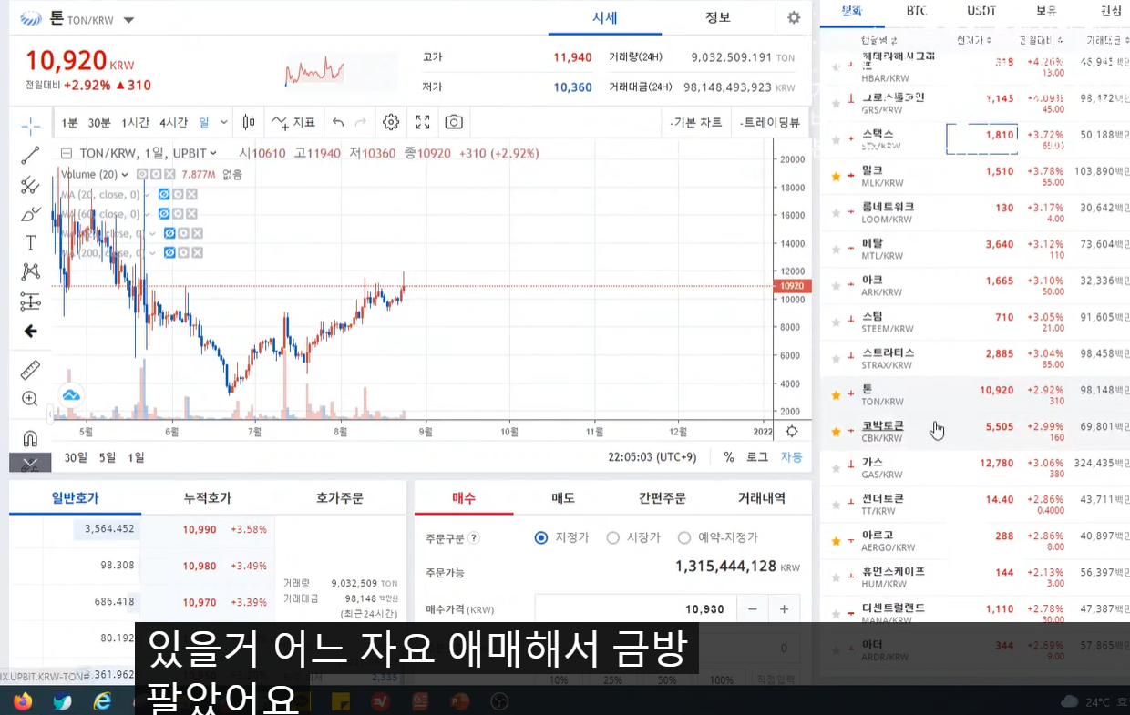 - 톤도 같은 관점으로 매수했지만, 하락 다이버전스 떠서 단타로 나왔다.