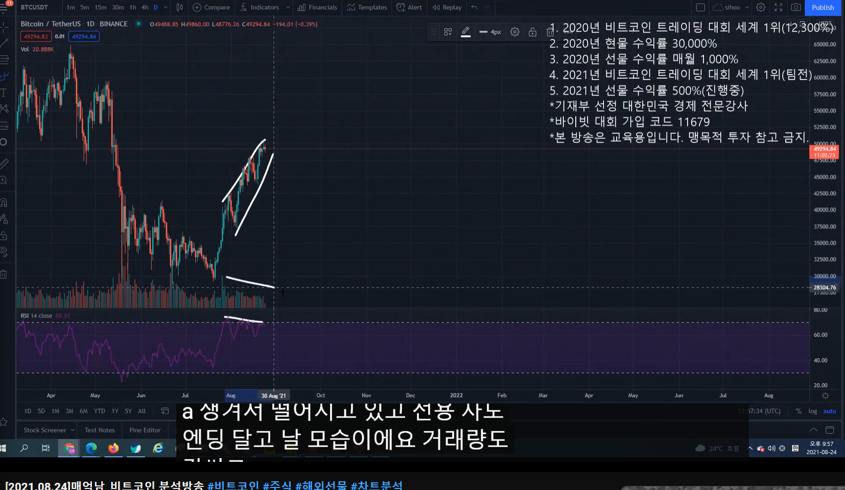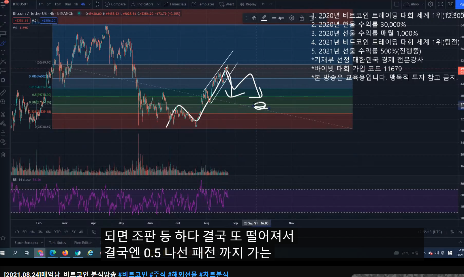 네 시간 봉과 일 봉을 보면 고점은 계속 올라가는데, rsi는 하락 추세에 있다.