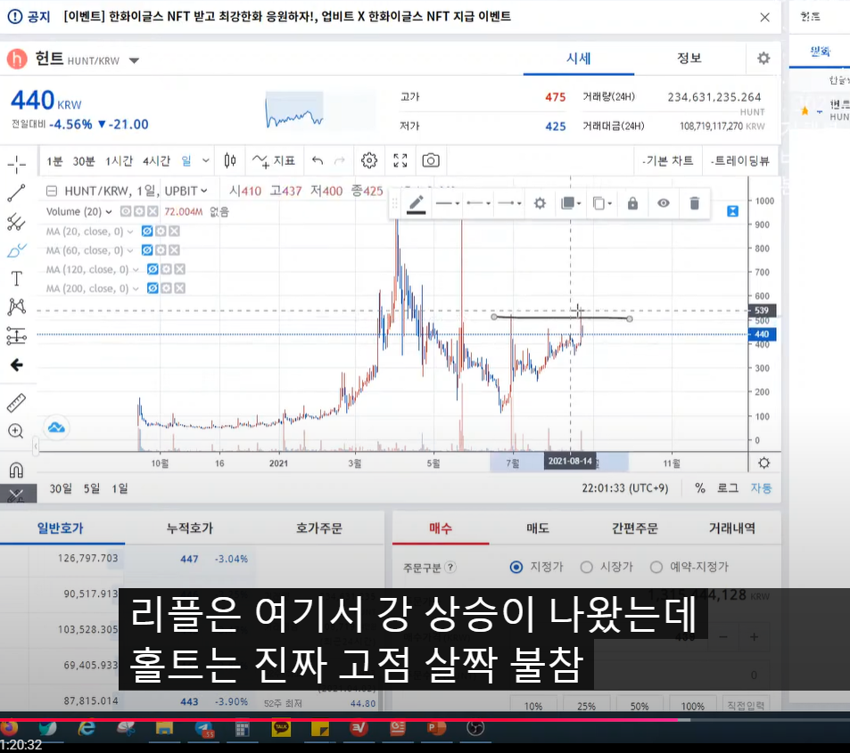 - 그렇게 매수한 것이 헌트. 헌트는 리플의 고점 상승보다는 작게 상승하고 바로 하락했다. 어쨌든 수익이 나긴 했다.