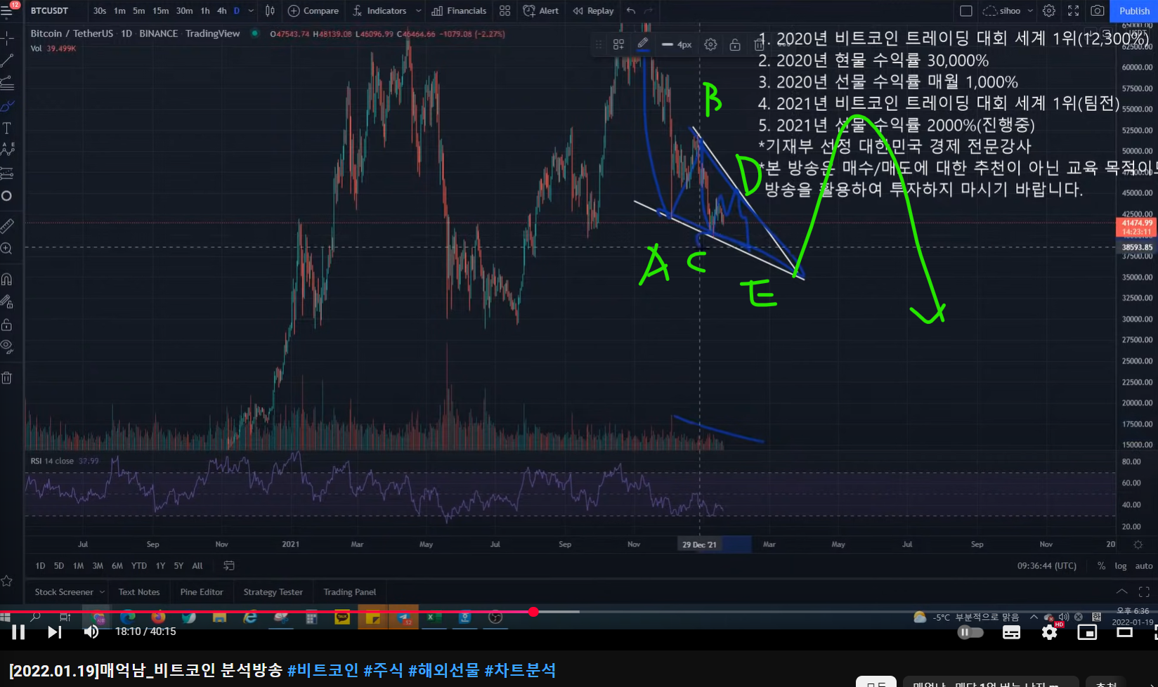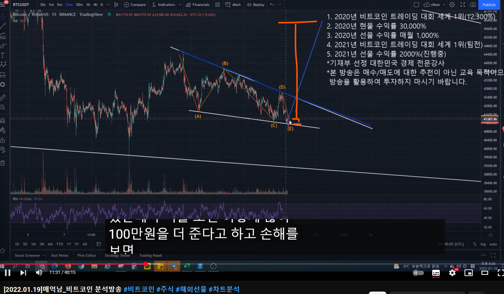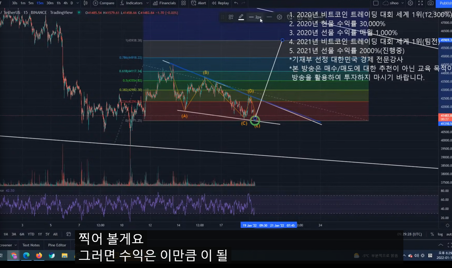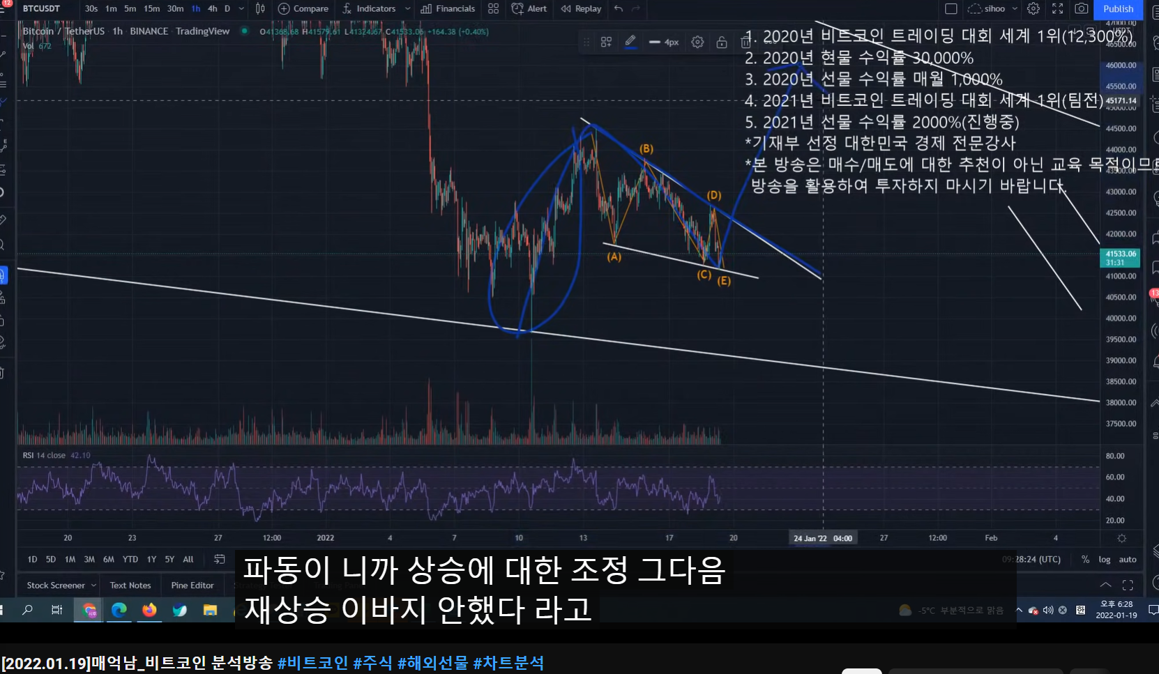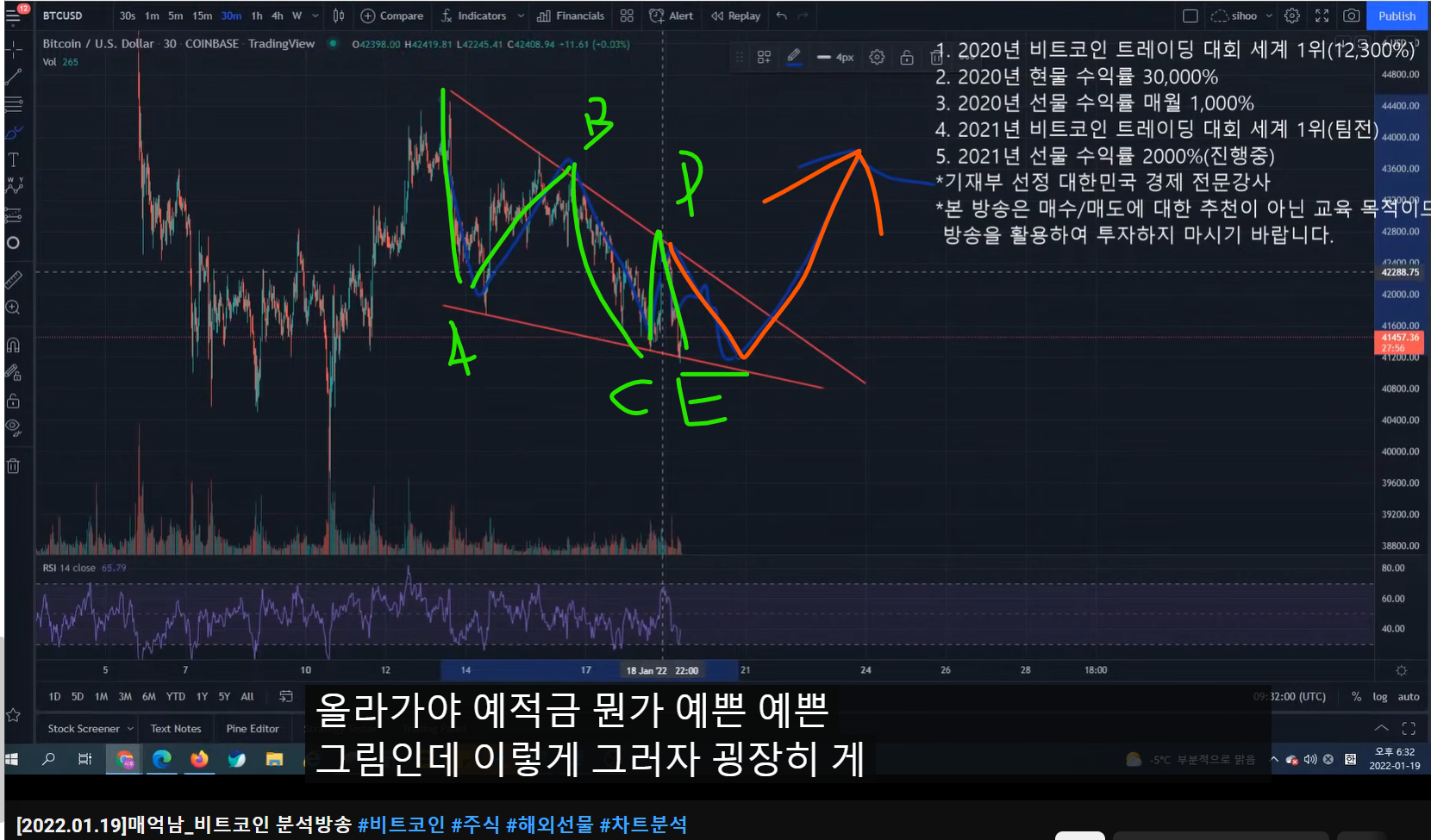 - 올라간 이후에 ABCDE의 폴링 웻지 패턴이 보인다.