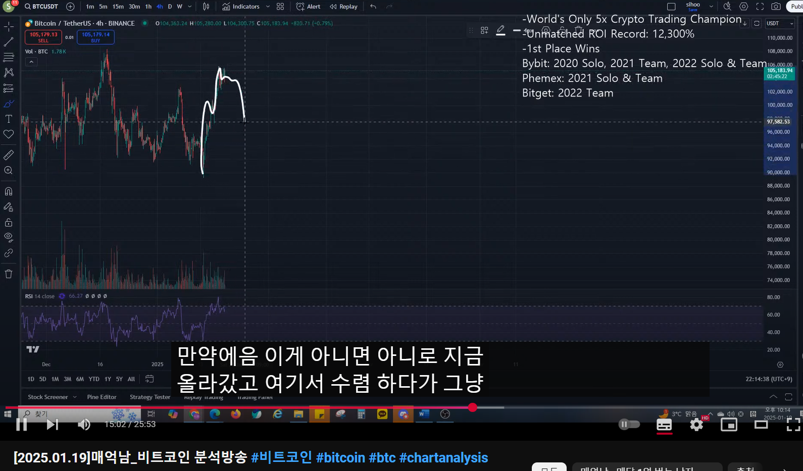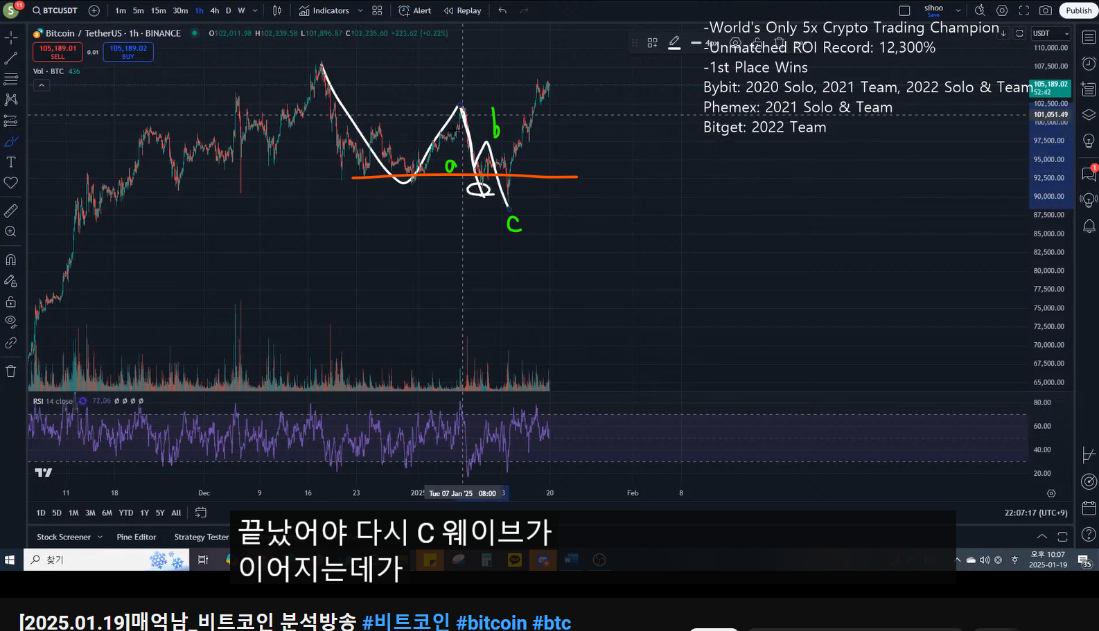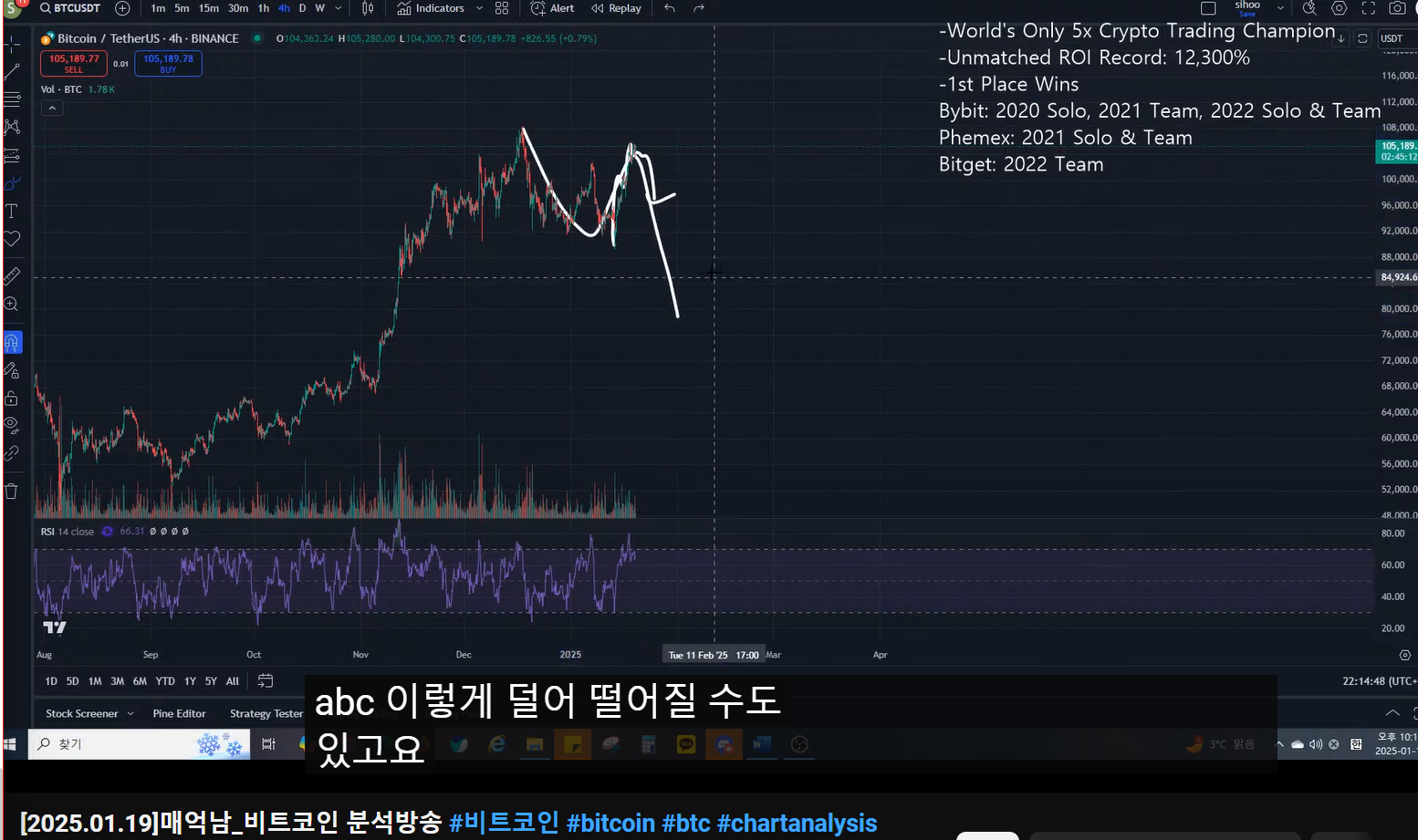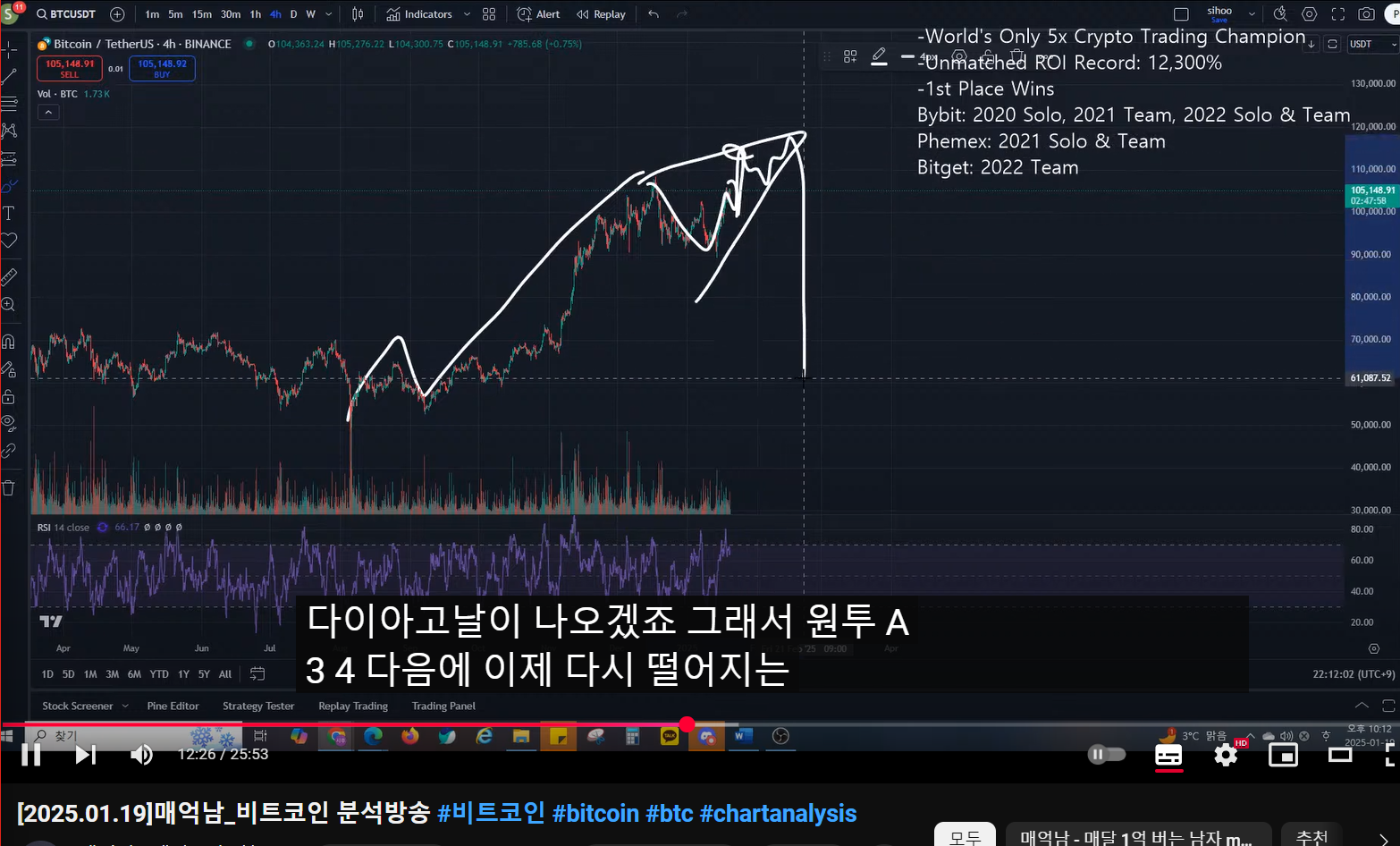 지난 방송 복기- 고점 찍고 ABC가 나온 것 같다.(짧게 끝난 것 같다.)- 반등이 올라올 것 같다.- 4시간 봉 상승 다이버전스 형성(A, C) : 추세 전환중기적 관점- 엔딩 또는 하락하는 관점- 두 관점 모두