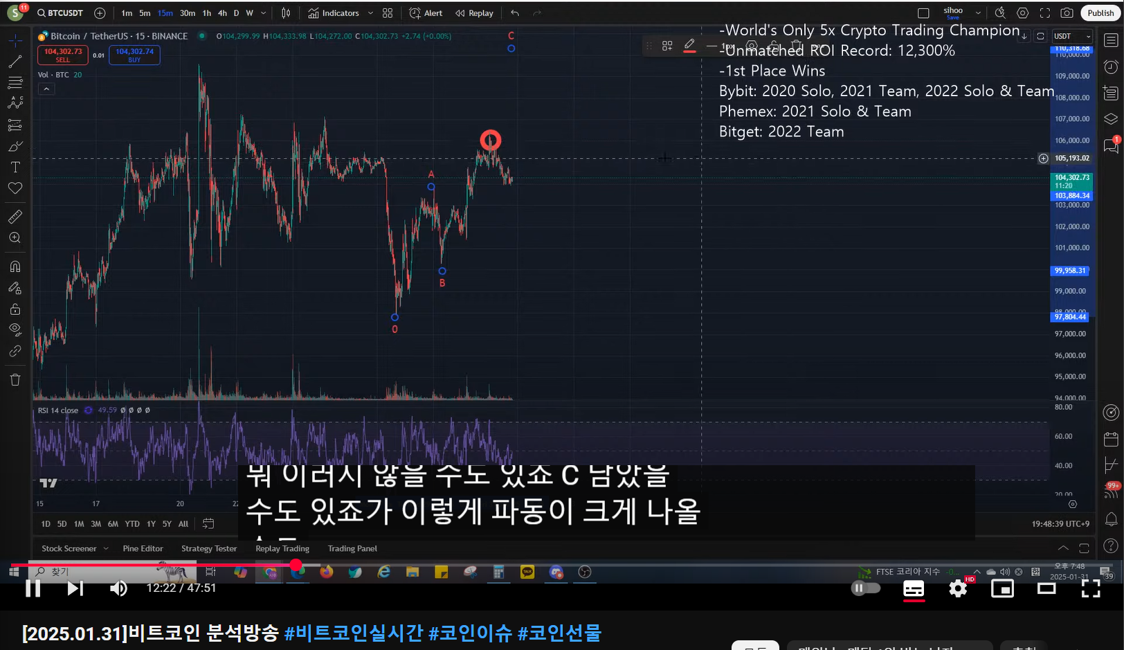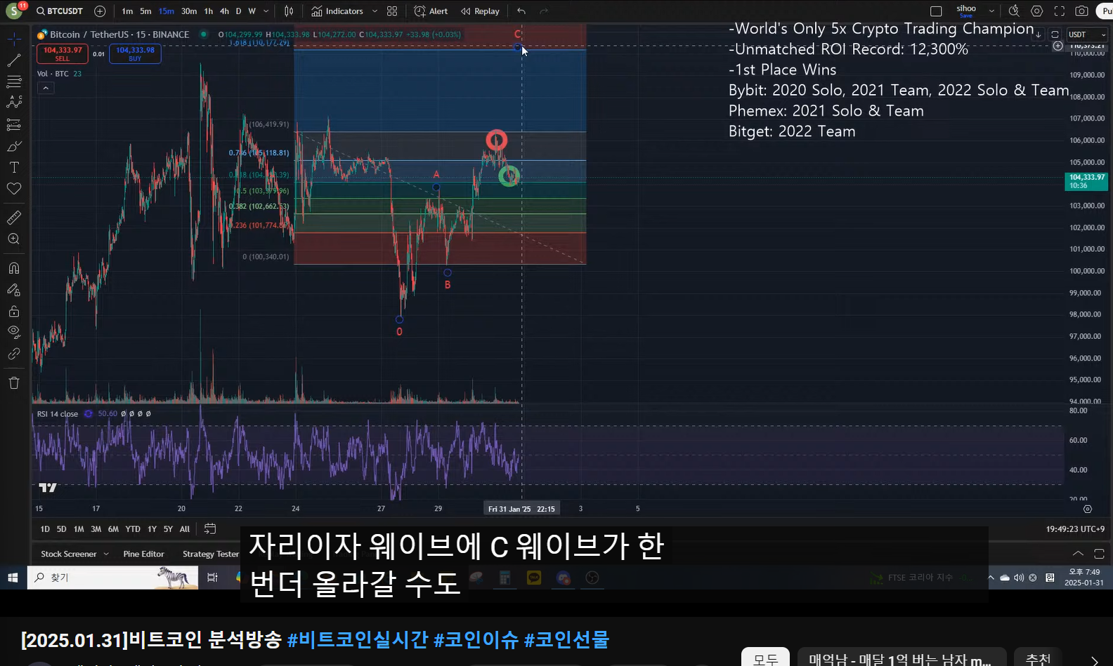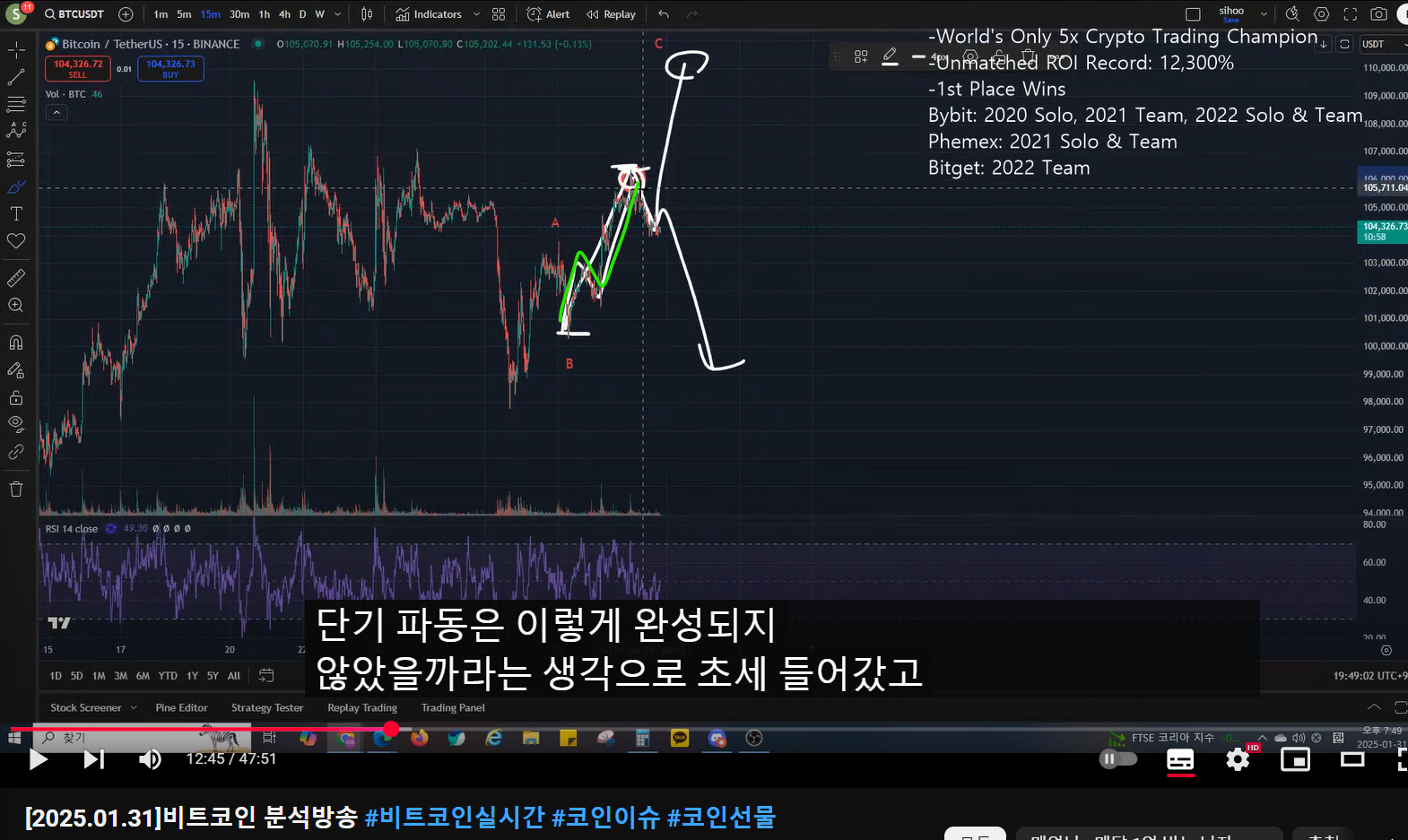 - 이대로 (작은 반등 이후) 떨어지는 관점이건, C가 연장돼서 엔딩을 만드는 관점이건 단기 파동은 연두 파동으로 완성되지 않았을까 해서 숏에 진입했다. (다시 말해 공통 구간이라는 것)